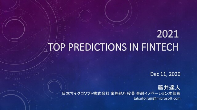 タイトル『2021年を展望 フィンテックトレンドのすべて』 発表者:藤井 達人@日本マイクロソフト