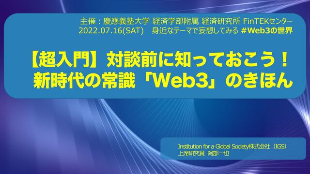 7/16(土) 慶應義塾大学経済学部附属経済研究所FinTEKセンターが主催する「身近なテーマで妄想してみる!Web3の世界」セミナーの午前で講演した発表資料です。