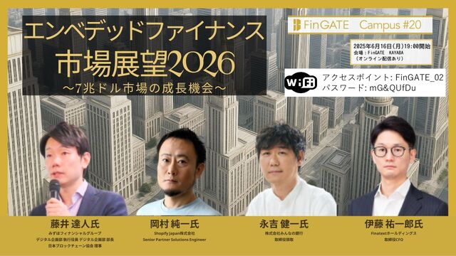 2025年6月16日に行われた『エンベデッドファイナンス市場展望2026〜7兆ドル市場の成長機会〜FinGATE Campus 第20回(フィンテック養成勉強会#53)』の進行スライド。 https://fintech-engineer.connpass.com/event/356364/