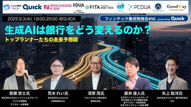 2025年9月3日に行われた『生成AIは銀行をどう変えるのか?トップランナーたちの未来予想図(フィンテック養成勉強会#56)』の進行スライド。 https://fintech-engineer.connpass.com/event/365728/