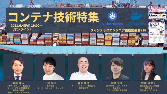 2021年6月4日に開催した『コンテナ技術特集(フィンテックエンジニア養成勉強会#16)』のオープニング・クロージングスライド。 https://fintech-engineer.connpass.com/event/211669/