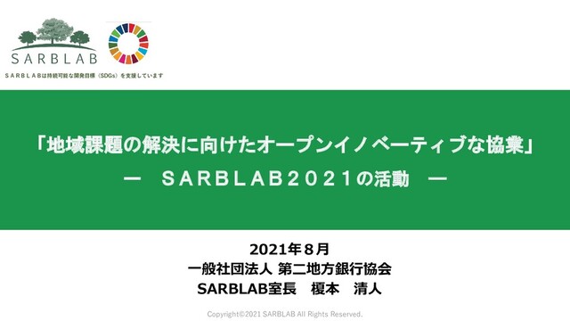 S A R B L A B Second Association of Regional Banks Laboratory 会員行とスタートアップとの連携・協業により、イノベーションに取組むプラットフォーム。 新常態の地域課題の解決とそれを支えるリレバンの進化を模索しつつ、SDGsやDXに取り組んでいます。 服部 守親 (SDGs、DX担当) 鈴木 正信 (SDGs担当) 加藤 徳浩 (DX担当) Contact [email protected] Mission Team About 榎本 清人 (SDGs、DX担当) 浦野 章 (SDGs、DX担当) 足立 直樹 (SDGs、DX担当) 藤嶋 かおり (SDGs担当) 槙嶋 友美 (DX担当) (SDGs、DX担当) 藤井 友梨