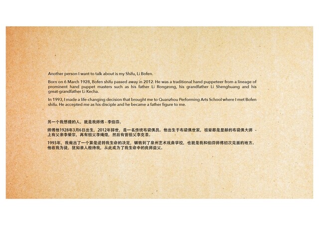 This Digital Resource is a repository that accompanies the Turn By Turn We Turn audio theatre, holding together the stories of traditional Chinese hand puppetry and how it has touched the different artists in The Finger Players. This segment traces Tan Beng Tian’s recollections of Li Bofen shifu and her time at the Quanzhou Performing Arts School.