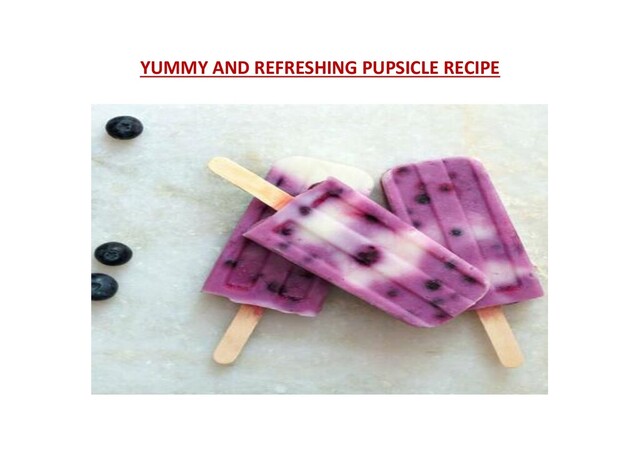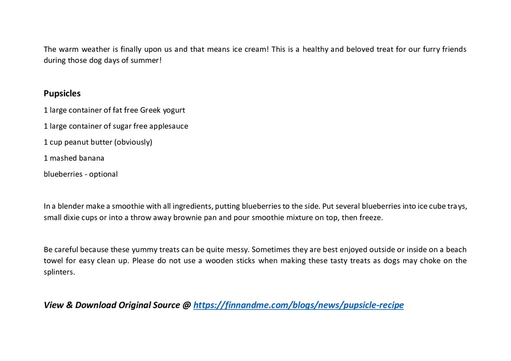 ice cream! This is a healthy and beloved treat for our furry friends during those dog days of summer! Pupsicles 1 large container of fat free Greek yogurt 1 large container of sugar free applesauce 1 cup peanut butter (obviously) 1 mashed banana blueberries - optional In a blender make a smoothie with all ingredients, putting blueberries to the side. Put several blueberries into ice cube trays, small dixie cups or into a throw away brownie pan and pour smoothie mixture on top, then freeze. Be careful because these yummy treats can be quite messy. Sometimes they are best enjoyed outside or inside on a beach towel for easy clean up. Please do not use a wooden sticks when making these tasty treats as dogs may choke on the splinters. View & Download Original Source @ https://finnandme.com/blogs/news/pupsicle-recipe