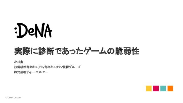 DeNA ではリリース・アップデートするゲームサービスに対して脆弱性診断を行っていま す。今回は過去に行われた脆弱性診断で実際にどのような脆弱性が見つかっているかを紹 介します。 また、そこからゲーム開発・運用時に注意すべき点について考察を行い、実際に DeNA で はどのようなことを行っているかについて紹介をします。
