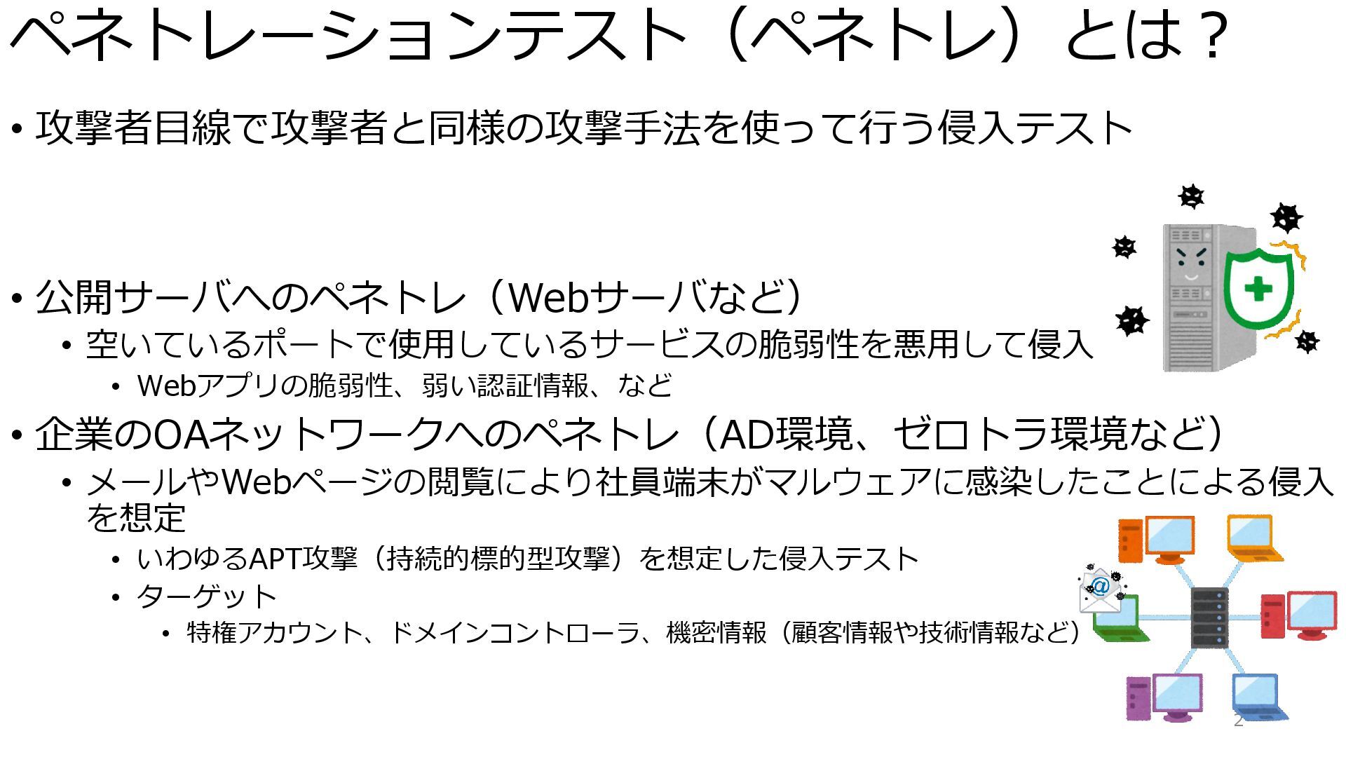 • 企業のOAネットワークへのペネトレ(AD環境、ゼロトラ環境など) • メールやWebページの閲覧により社員端末がマルウェアに感染したことによる侵入 を想定 • いわゆるAPT攻撃(持続的標的型攻撃)を想定した侵入テスト • ターゲット • 特権アカウント、ドメインコントローラ、機密情報(顧客情報や技術情報など)