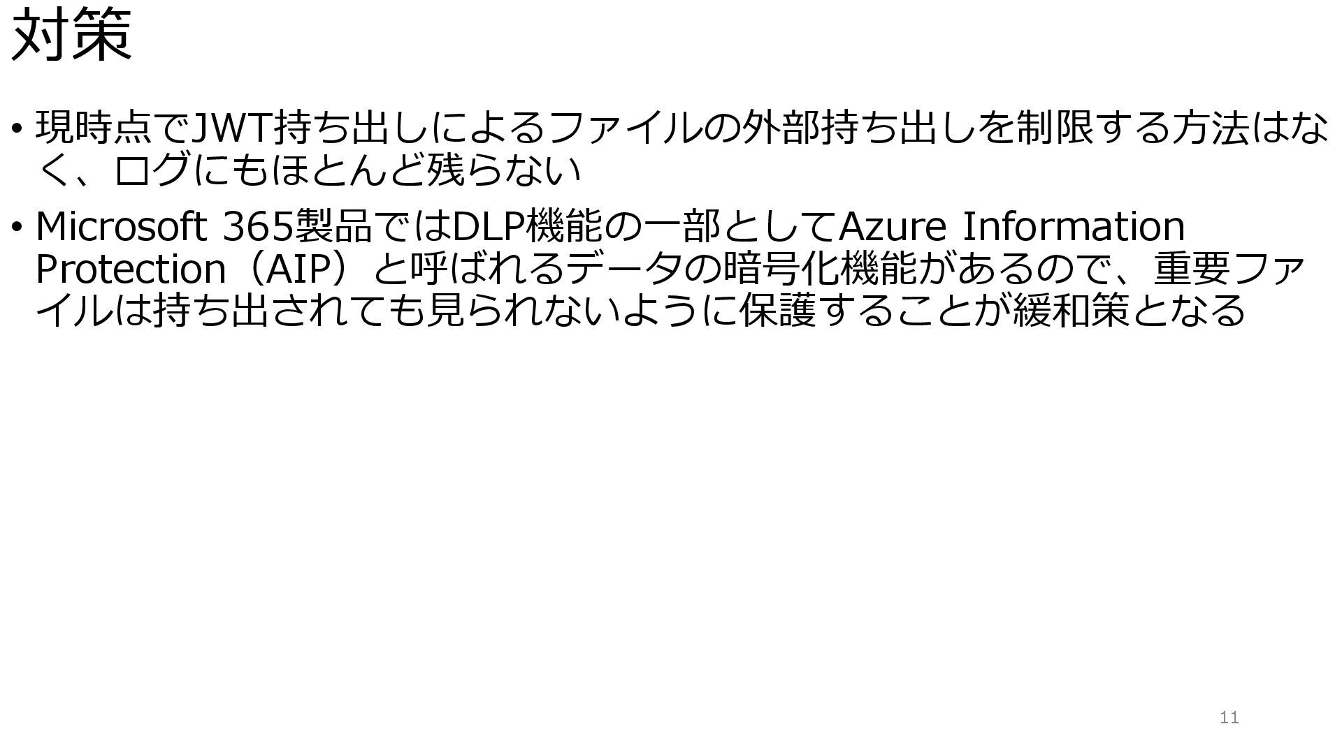 対策 • 現時点でJWT持ち出しによるファイルの外部持ち出しを制限する方法はな く、ログにもほとんど残らない • Microsoft 365製品ではDLP機能の一部としてAzure Information Protection(AIP)と呼ばれるデータの暗号化機能があるので、重要ファ イルは持ち出されても見られないように保護することが緩和策となる
