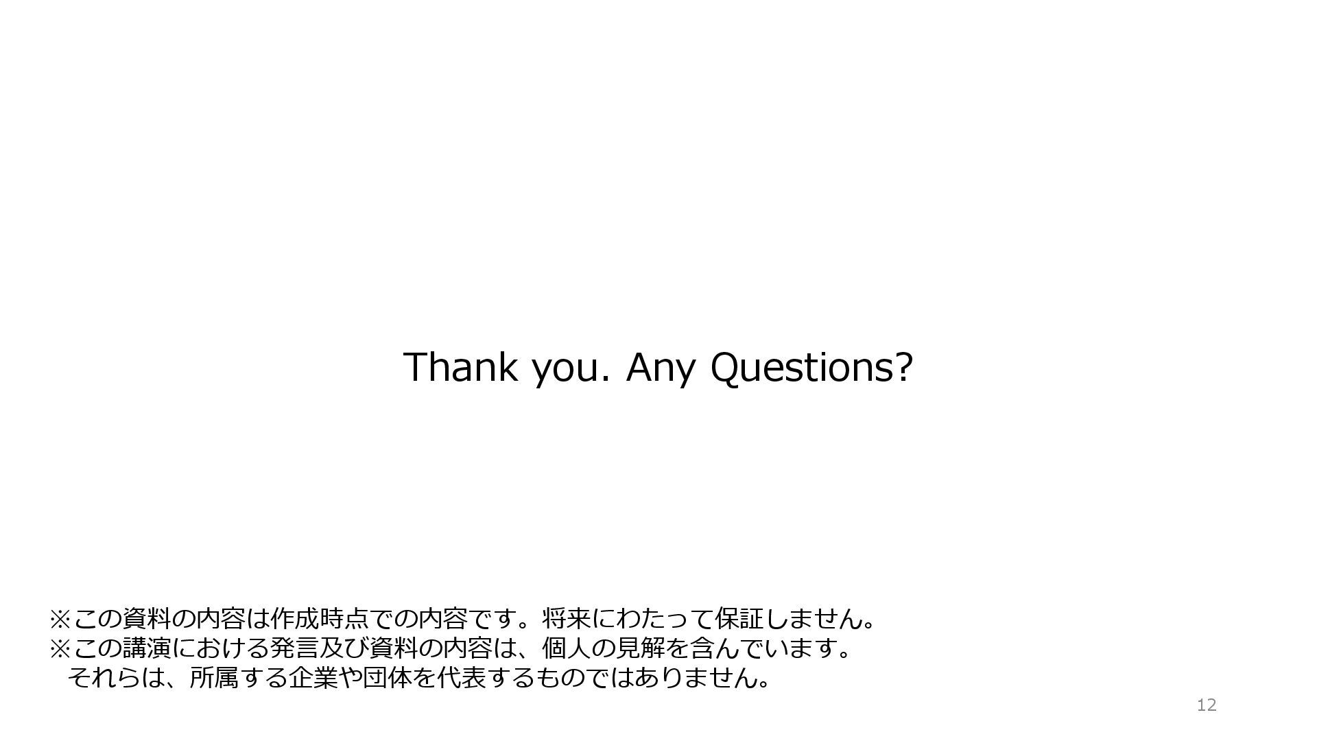 Thank you. Any Questions? ※この資料の内容は作成時点での内容です。将来にわたって保証しません。 ※この講演における発言及び資料の内容は、個人の見解を含んでいます。 それらは、所属する企業や団体を代表するものではありません。 12