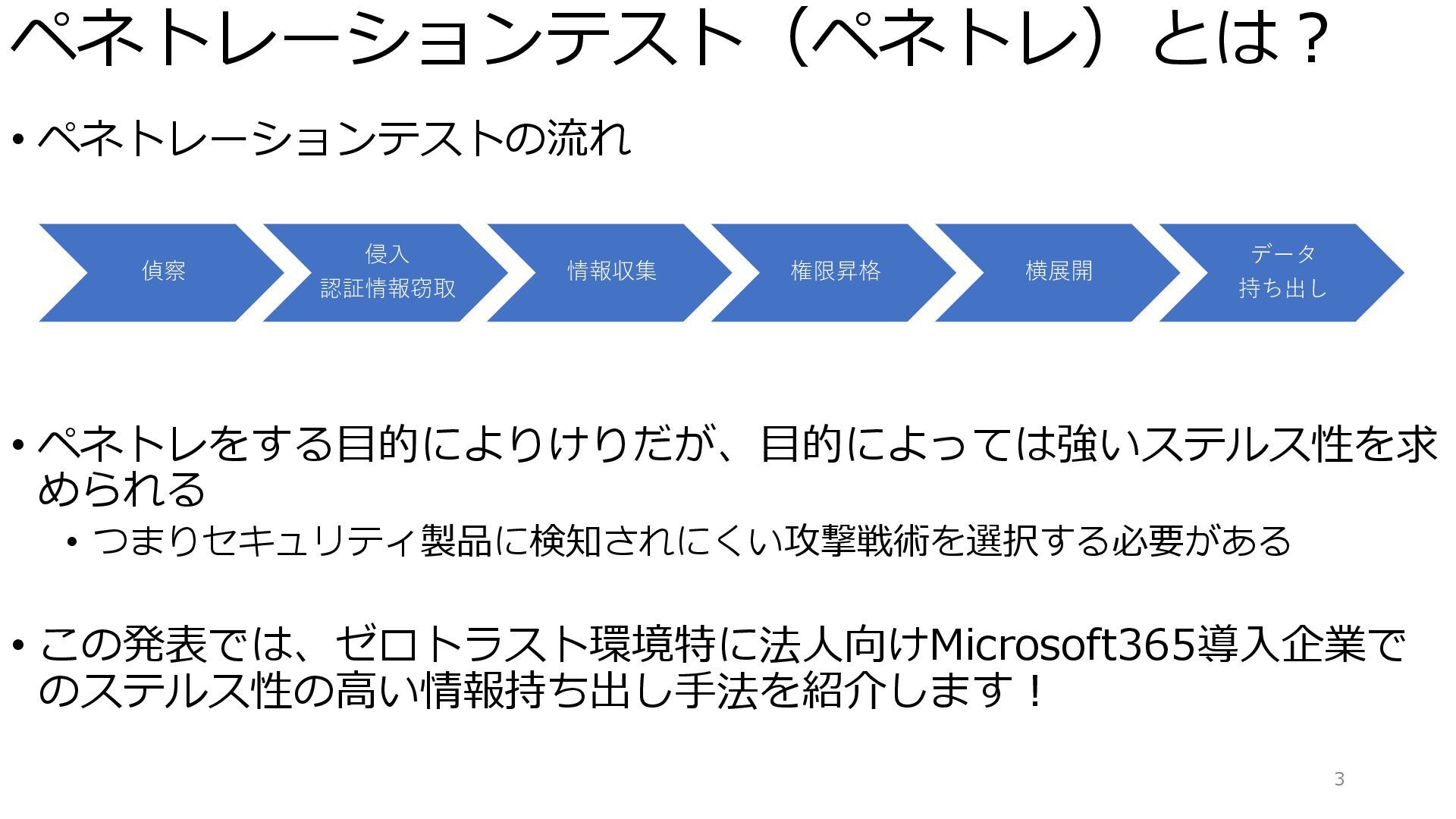 ペネトレーションテスト(ペネトレ)とは? • ペネトレーションテストの流れ • ペネトレをする目的によりけりだが、目的によっては強いステルス性を求 められる • つまりセキュリティ製品に検知されにくい攻撃戦術を選択する必要がある • この発表では、ゼロトラスト環境特に法人向けMicrosoft365導入企業で