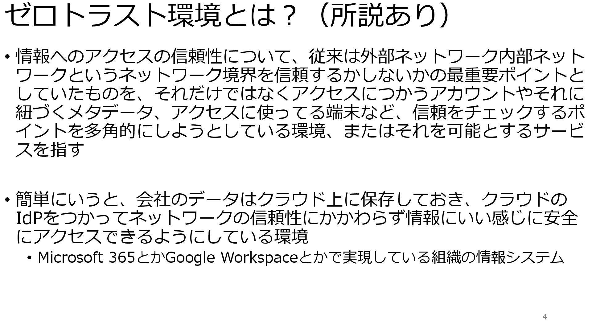 ゼロトラスト環境とは?(所説あり) • 情報へのアクセスの信頼性について、従来は外部ネットワーク内部ネット ワークというネットワーク境界を信頼するかしないかの最重要ポイントと していたものを、それだけではなくアクセスにつかうアカウントやそれに 紐づくメタデータ、アクセスに使ってる端末など、信頼をチェックするポ イントを多角的にしようとしている環境、またはそれを可能とするサービ スを指す • 簡単にいうと、会社のデータはクラウド上に保存しておき、クラウドの