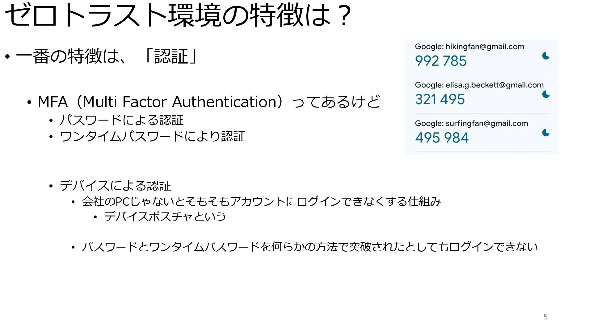 ゼロトラスト環境の特徴は? • 一番の特徴は、「認証」 • MFA(Multi Factor Authentication)ってあるけど • パスワードによる認証 •