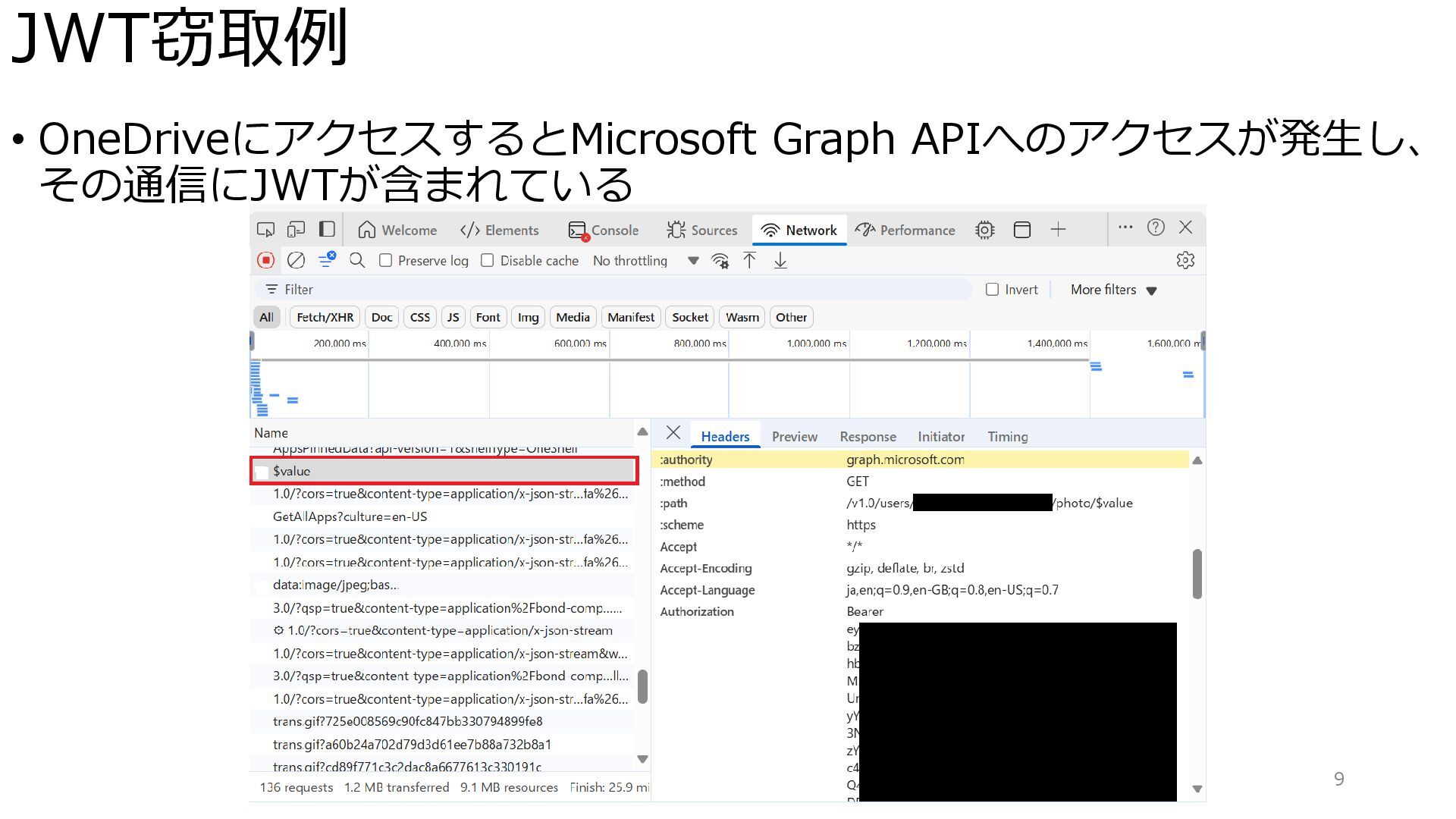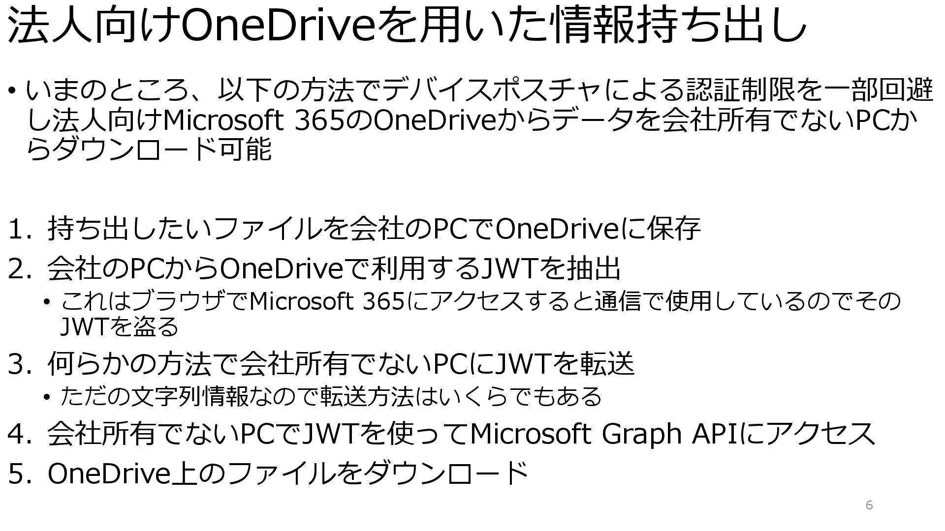 • これはブラウザでMicrosoft 365にアクセスすると通信で使用しているのでその JWTを盗る 3. 何らかの方法で会社所有でないPCにJWTを転送 • ただの文字列情報なので転送方法はいくらでもある 4. 会社所有でないPCでJWTを使ってMicrosoft Graph APIにアクセス 5. OneDrive上のファイルをダウンロード 6