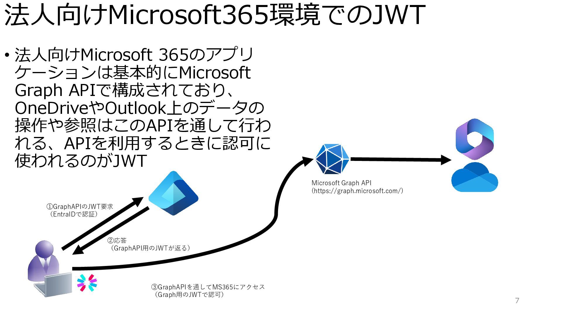 • 法人向けMicrosoft 365のアプリ ケーションは基本的にMicrosoft Graph APIで構成されており、 OneDriveやOutlook上のデータの 操作や参照はこのAPIを通して行わ れる、APIを利用するときに認可に 使われるのがJWT