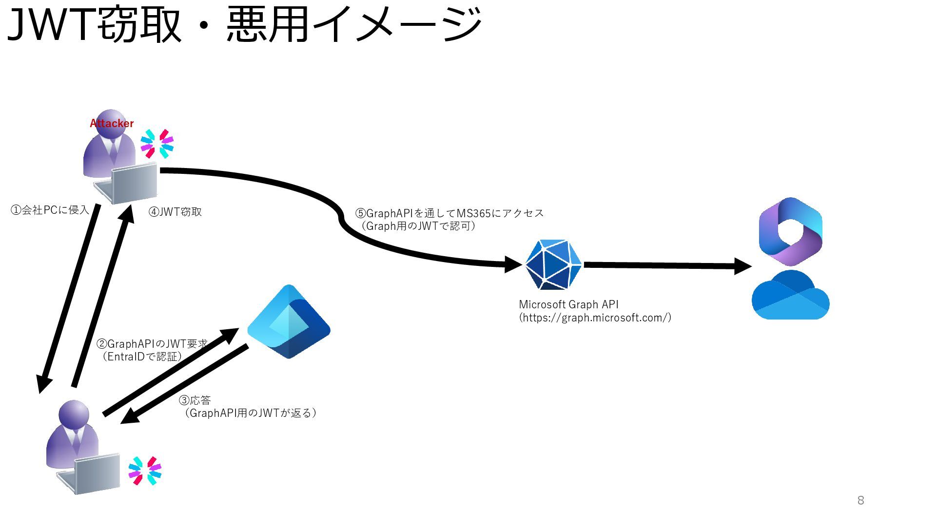 8 JWT窃取・悪用イメージ Microsoft Graph API (https://graph.microsoft.com/) ②GraphAPIのJWT要求 (EntraIDで認証) ③応答 (GraphAPI用のJWTが返る)