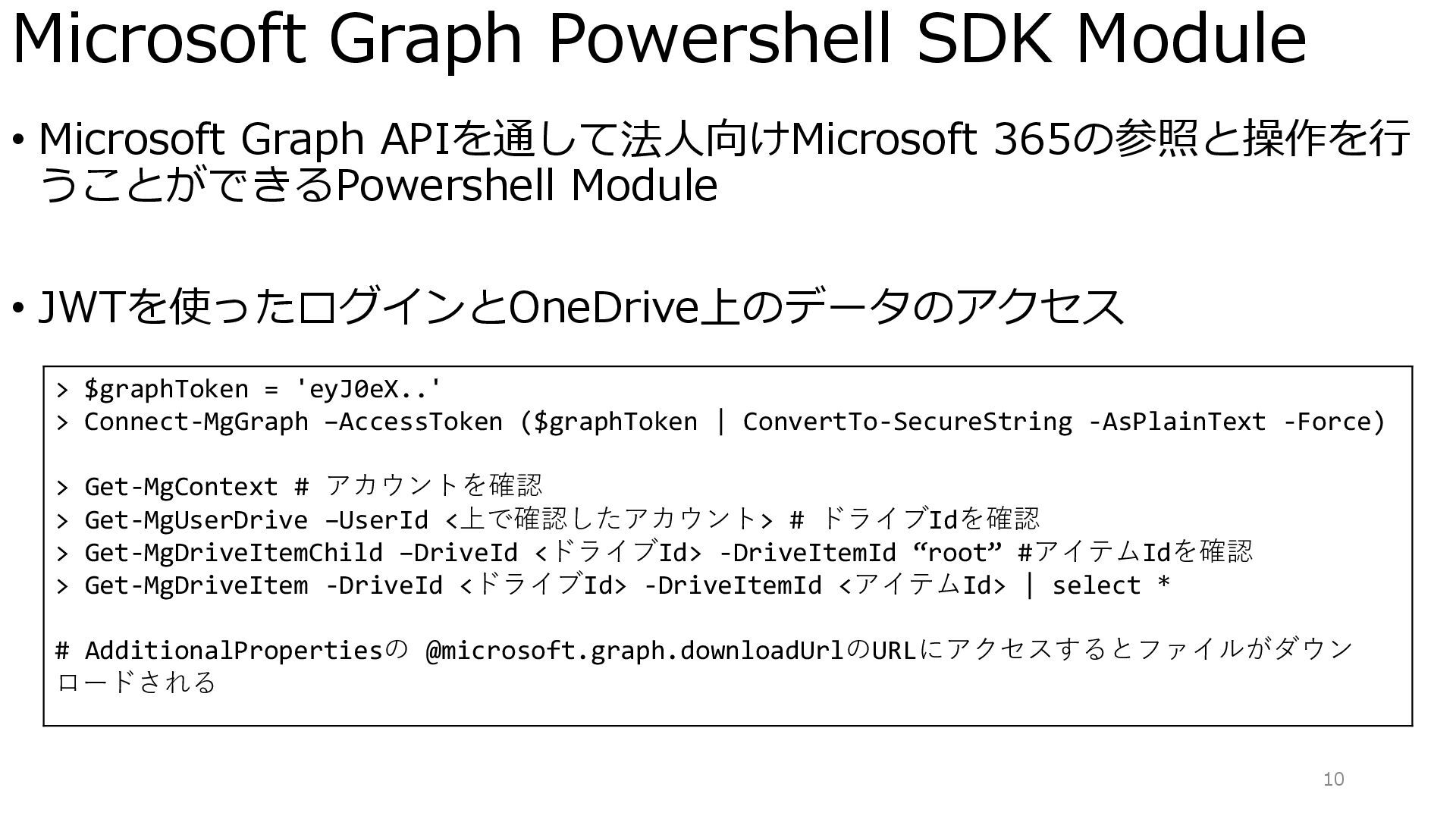 うことができるPowershell Module • JWTを使ったログインとOneDrive上のデータのアクセス 10 > $graphToken = 'eyJ0eX..' > Connect-MgGraph –AccessToken ($graphToken | ConvertTo-SecureString -AsPlainText -Force) > Get-MgContext # アカウントを確認 > Get-MgUserDrive –UserId <上で確認したアカウント> # ドライブIdを確認 > Get-MgDriveItemChild –DriveId <ドライブId> -DriveItemId “root” #アイテムIdを確認 > Get-MgDriveItem -DriveId <ドライブId> -DriveItemId <アイテムId> | select * # AdditionalPropertiesの @microsoft.graph.downloadUrlのURLにアクセスするとファイルがダウン ロードされる