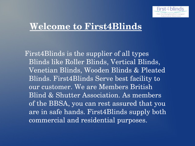 Blinds like Roller Blinds, Vertical Blinds, Venetian Blinds, Wooden Blinds & Pleated Blinds. First4Blinds Serve best facility to our customer. We are Members British Blind & Shutter Association. As members of the BBSA, you can rest assured that you are in safe hands. First4Blinds supply both commercial and residential purposes.