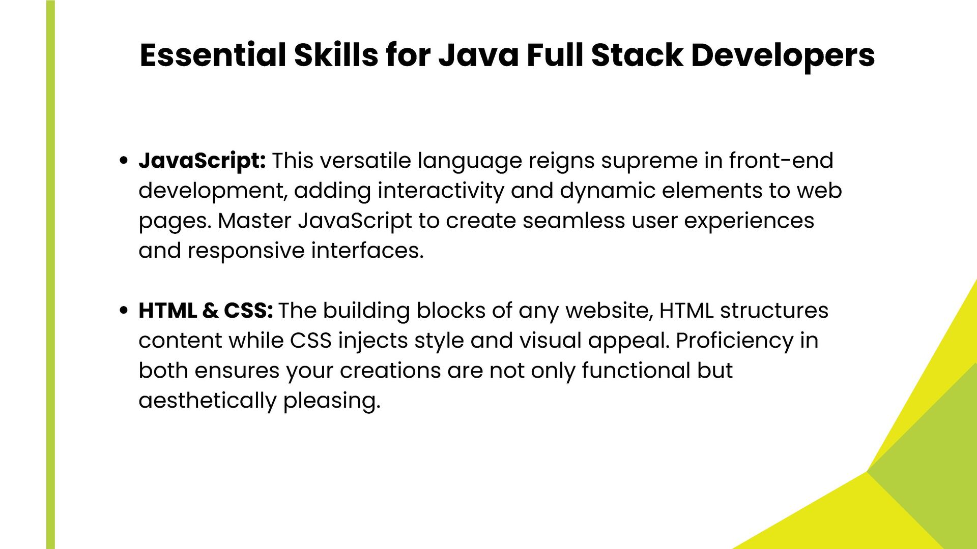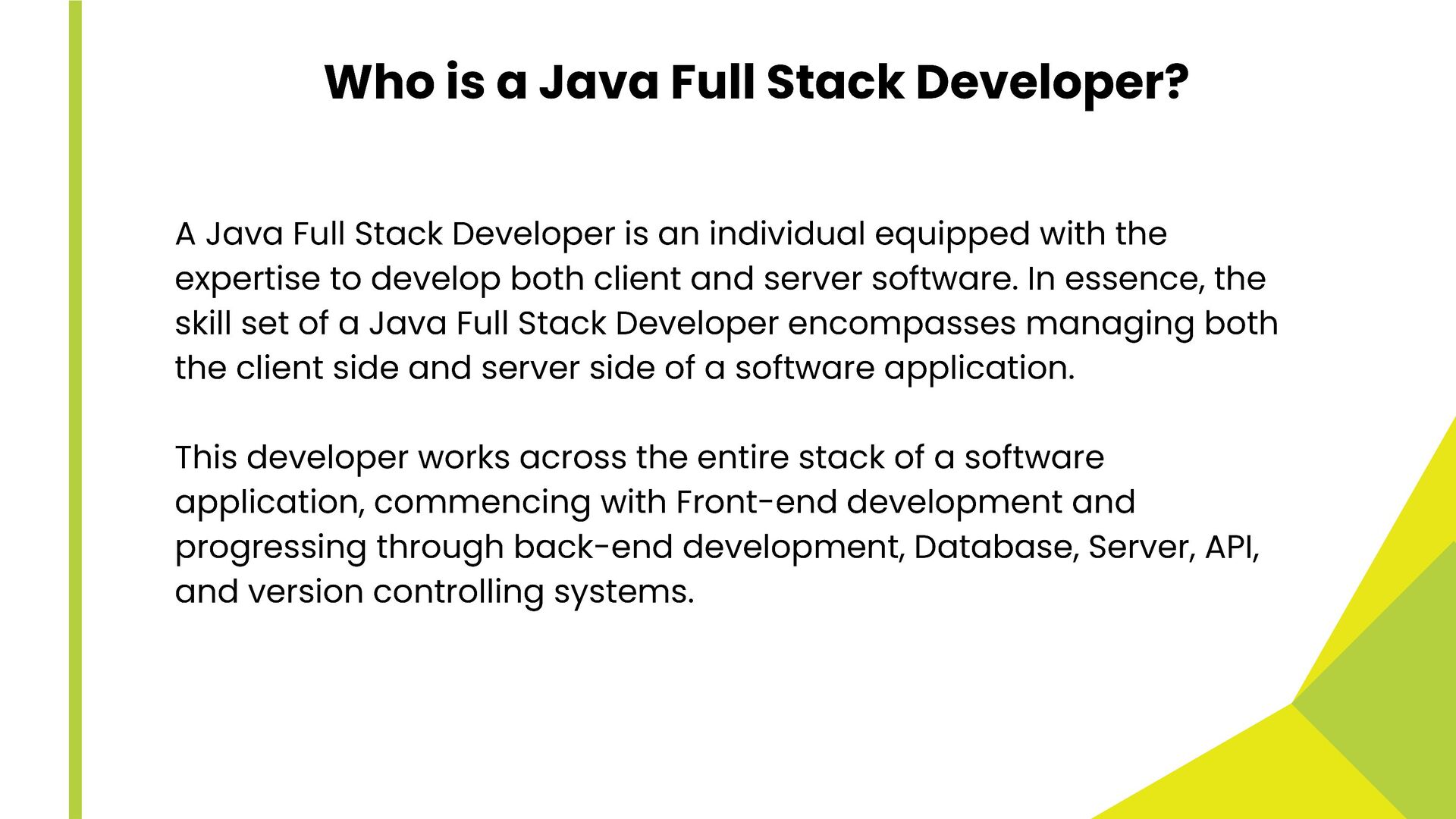A Java Full Stack Developer is an individual equipped with the expertise to develop both client and server software. In essence, the skill set of a Java Full Stack Developer encompasses managing both the client side and server side of a software application.