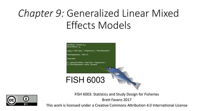 Fish Size increase? 2. As we add food, how much does this relationship adjust upward? Low food → Medium food 3. Allow the regression line to adjust up or down for each tank (some tanks are better than others) 4. Allow the line to adjust up or down for each individual fish (some fish are better at growing than others) This model basically says there will be one regression line for every single fish. All have the same slope, but are adjusted up or down (i.e. their intercept shifts based on treatment (fixed), tank (random), and fish ID (random) Fixed part: Random part: