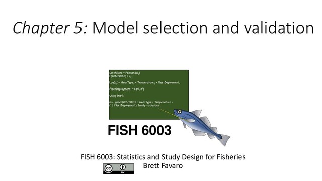 ij ) E(CatchRate) = μ ij Log(μ ij ) = GearType ij + Temperature ij + FleetDeployment i FleetDeployment i ~ N(0, σ2) Using lme4: m <- glmer(CatchRate ~ GearType + Temperature + (1 | FleetDeployment), family = poisson) FISH 6003 FISH 6003: Statistics and Study Design for Fisheries Brett Favaro