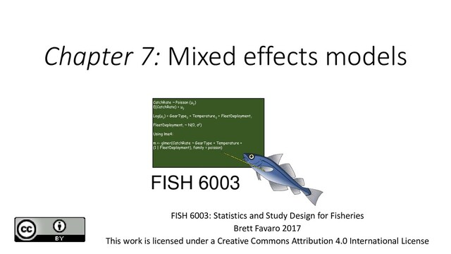 ) = σ2 Sizei = β0 + FoodTreatmenti Change our model What is happening here? ai is the random intercept There are i tanks. i = 1, … 9. Each tank has a slightly different y intercept. The mean of these intercepts is 0, and the variance is σ2 Tank There are j observations within each tank. Since all tanks have six fish, j = 1, … 6. Sizeij ~ N(μij , σ2) E(Sizeij ) = μij Var(Sizeij ) = σ2 Sizeij = β0 + FoodTreatmentij + ai ai ~ N(0, σ2 Tank )