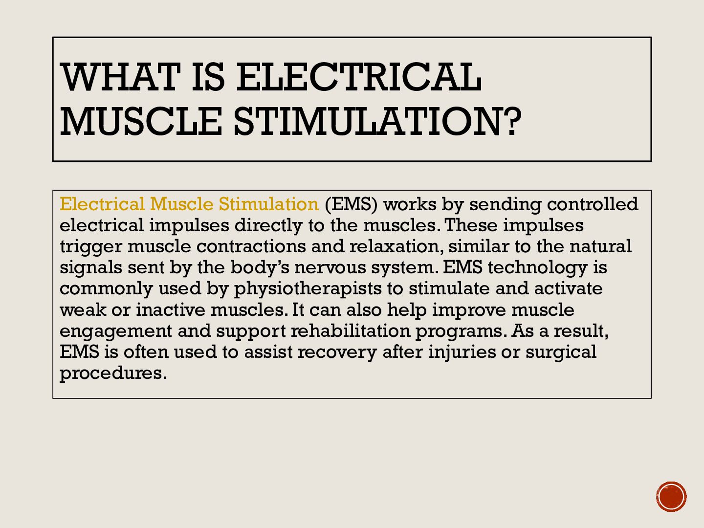 by sending controlled electrical impulses directly to the muscles. These impulses trigger muscle contractions and relaxation, similar to the natural signals sent by the body’s nervous system. EMS technology is commonly used by physiotherapists to stimulate and activate weak or inactive muscles. It can also help improve muscle engagement and support rehabilitation programs. As a result, EMS is often used to assist recovery after injuries or surgical procedures.