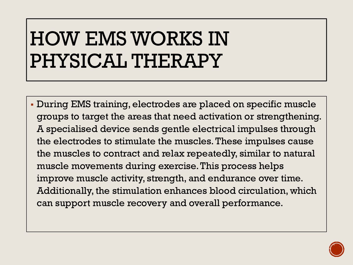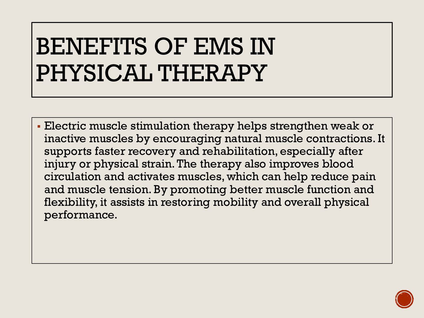 therapy helps strengthen weak or inactive muscles by encouraging natural muscle contractions. It supports faster recovery and rehabilitation, especially after injury or physical strain. The therapy also improves blood circulation and activates muscles, which can help reduce pain and muscle tension. By promoting better muscle function and flexibility, it assists in restoring mobility and overall physical performance.