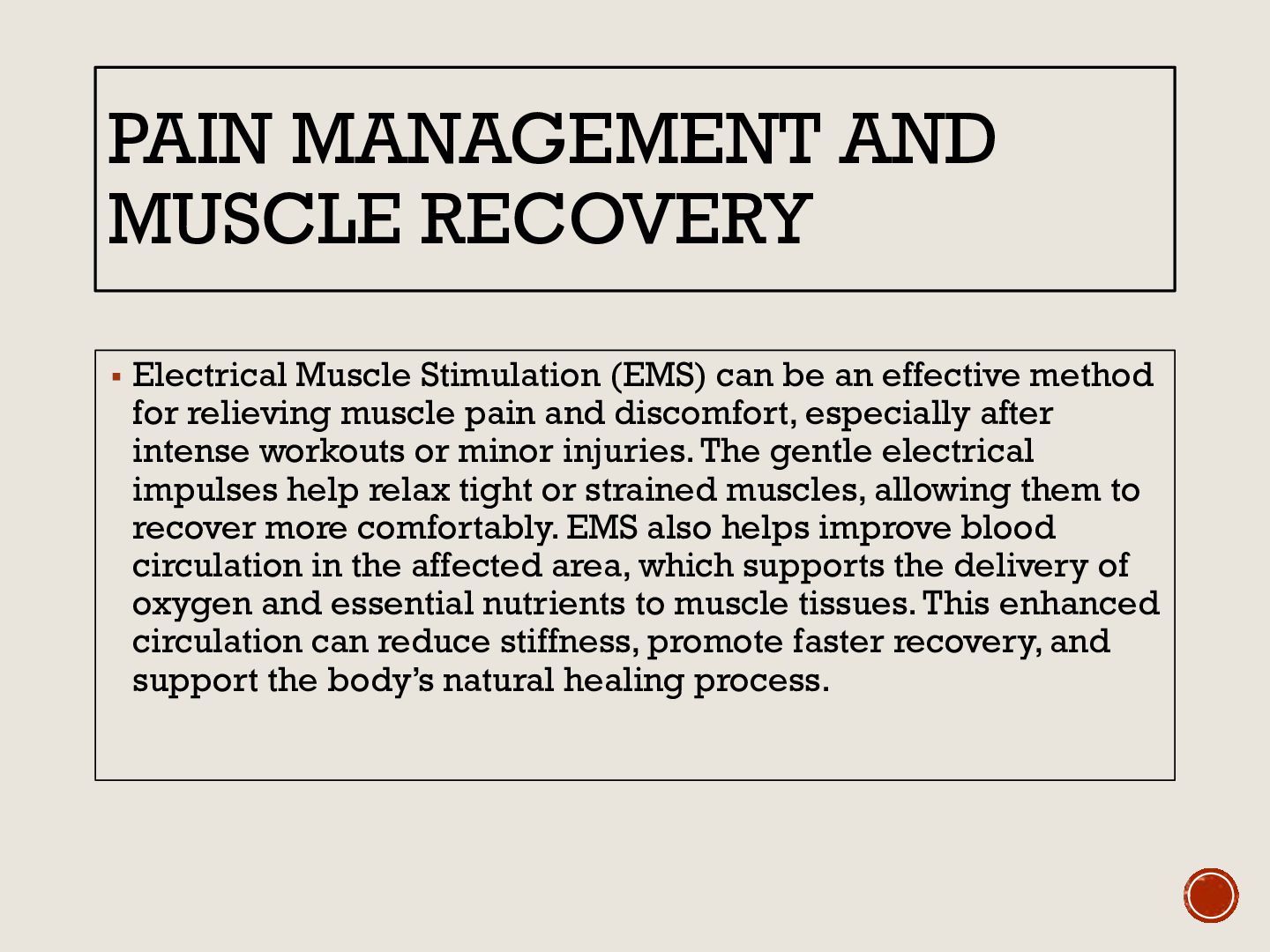 can be an effective method for relieving muscle pain and discomfort, especially after intense workouts or minor injuries. The gentle electrical impulses help relax tight or strained muscles, allowing them to recover more comfortably. EMS also helps improve blood circulation in the affected area, which supports the delivery of oxygen and essential nutrients to muscle tissues. This enhanced circulation can reduce stiffness, promote faster recovery, and support the body’s natural healing process.