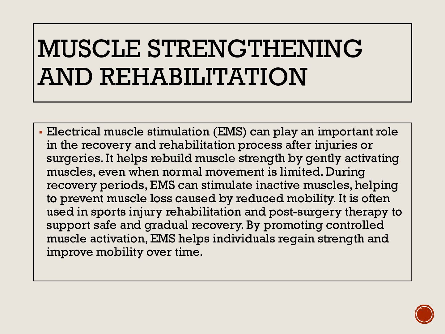 play an important role in the recovery and rehabilitation process after injuries or surgeries. It helps rebuild muscle strength by gently activating muscles, even when normal movement is limited. During recovery periods, EMS can stimulate inactive muscles, helping to prevent muscle loss caused by reduced mobility. It is often used in sports injury rehabilitation and post-surgery therapy to support safe and gradual recovery. By promoting controlled muscle activation, EMS helps individuals regain strength and improve mobility over time.