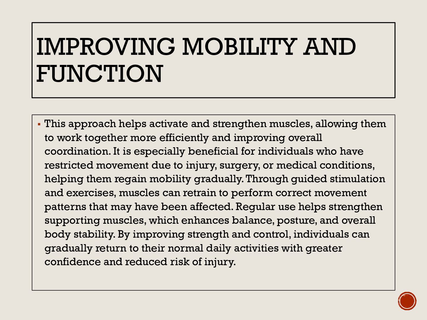 strengthen muscles, allowing them to work together more efficiently and improving overall coordination. It is especially beneficial for individuals who have restricted movement due to injury, surgery, or medical conditions, helping them regain mobility gradually. Through guided stimulation and exercises, muscles can retrain to perform correct movement patterns that may have been affected. Regular use helps strengthen supporting muscles, which enhances balance, posture, and overall body stability. By improving strength and control, individuals can gradually return to their normal daily activities with greater confidence and reduced risk of injury.