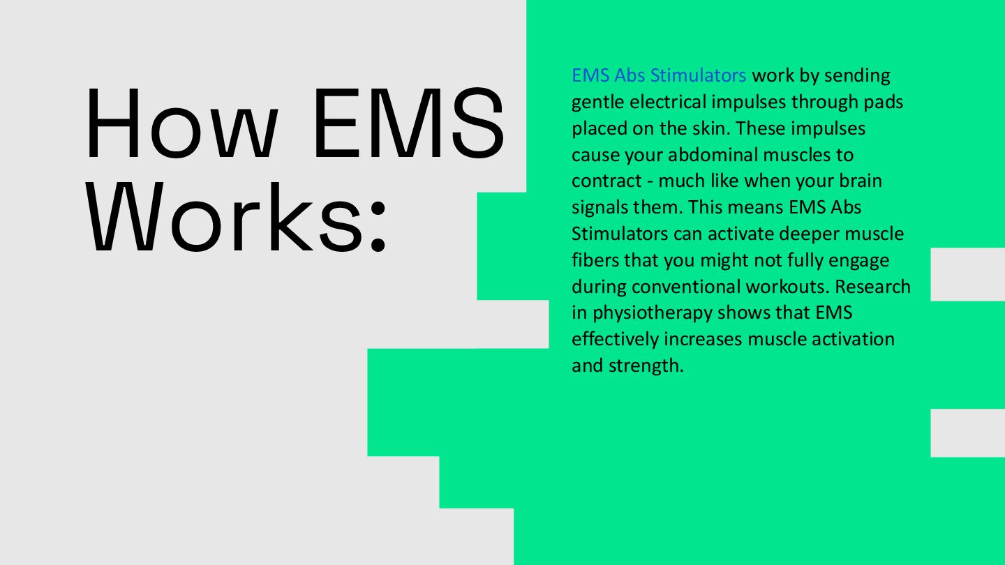 electrical impulses through pads placed on the skin. These impulses cause your abdominal muscles to contract - much like when your brain signals them. This means EMS Abs Stimulators can activate deeper muscle fibers that you might not fully engage during conventional workouts. Research in physiotherapy shows that EMS effectively increases muscle activation and strength.
