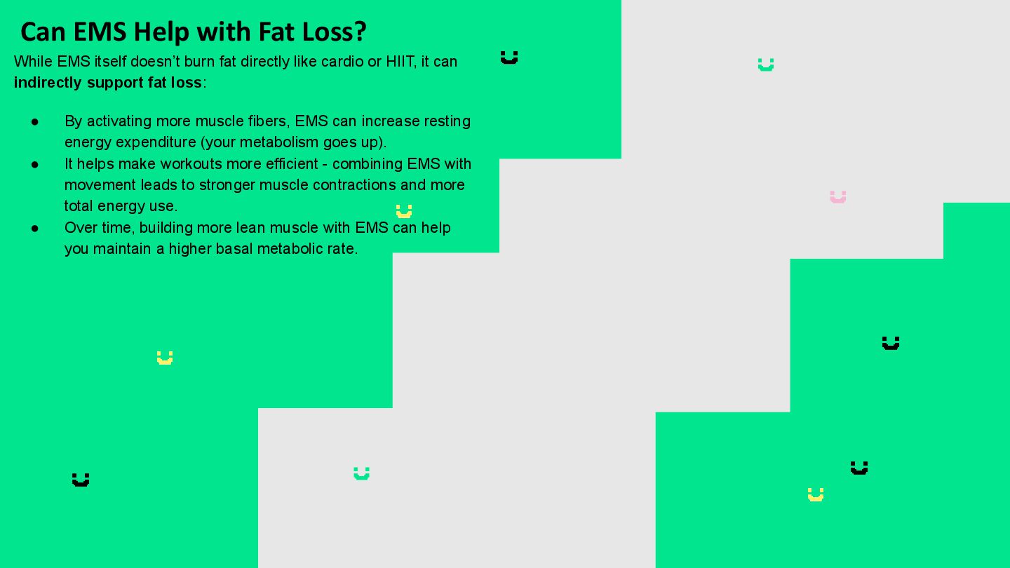 burn fat directly like cardio or HIIT, it can indirectly support fat loss: • By activating more muscle fibers, EMS can increase resting energy expenditure (your metabolism goes up). • It helps make workouts more efficient - combining EMS with movement leads to stronger muscle contractions and more total energy use. • Over time, building more lean muscle with EMS can help you maintain a higher basal metabolic rate.