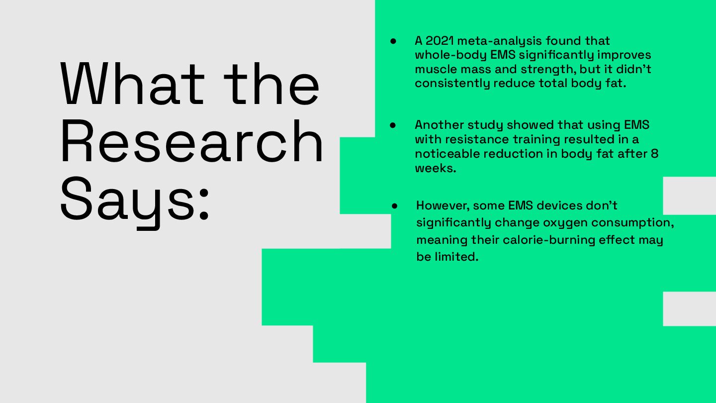 EMS with resistance training resulted in a noticeable reduction in body fat after 8 weeks. • A 2021 meta-analysis found that whole-body EMS significantly improves muscle mass and strength, but it didn’t consistently reduce total body fat. • However, some EMS devices don’t significantly change oxygen consumption, meaning their calorie-burning effect may be limited.