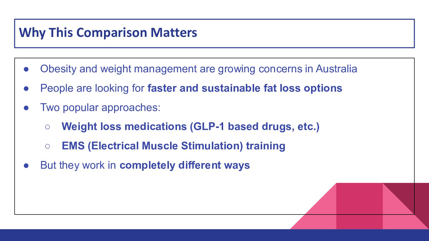 growing concerns in Australia • People are looking for faster and sustainable fat loss options • Two popular approaches: ◦ Weight loss medications (GLP-1 based drugs, etc.) ◦ EMS (Electrical Muscle Stimulation) training • But they work in completely different ways