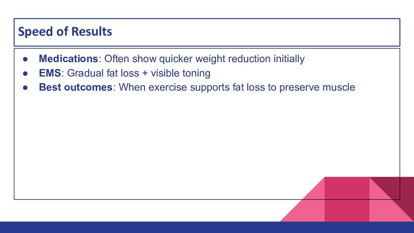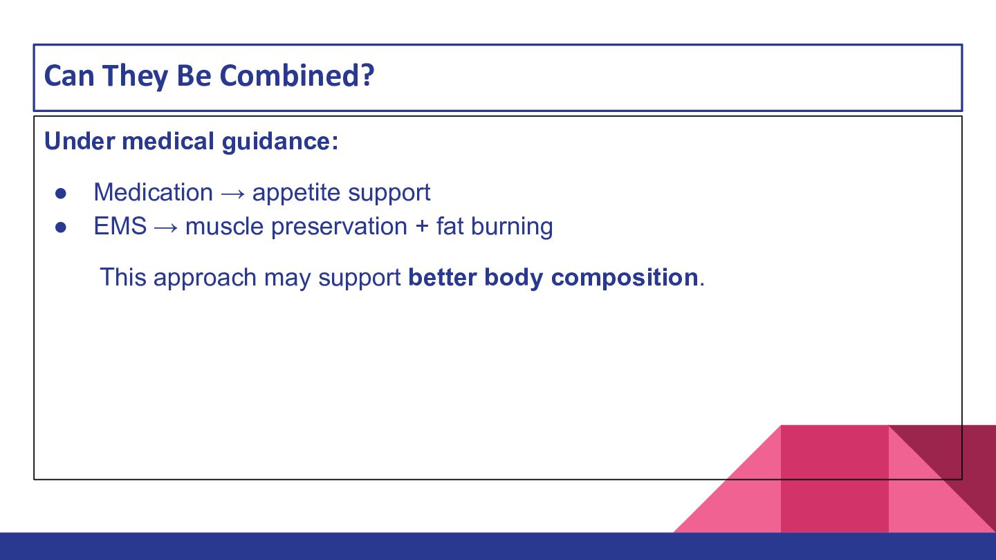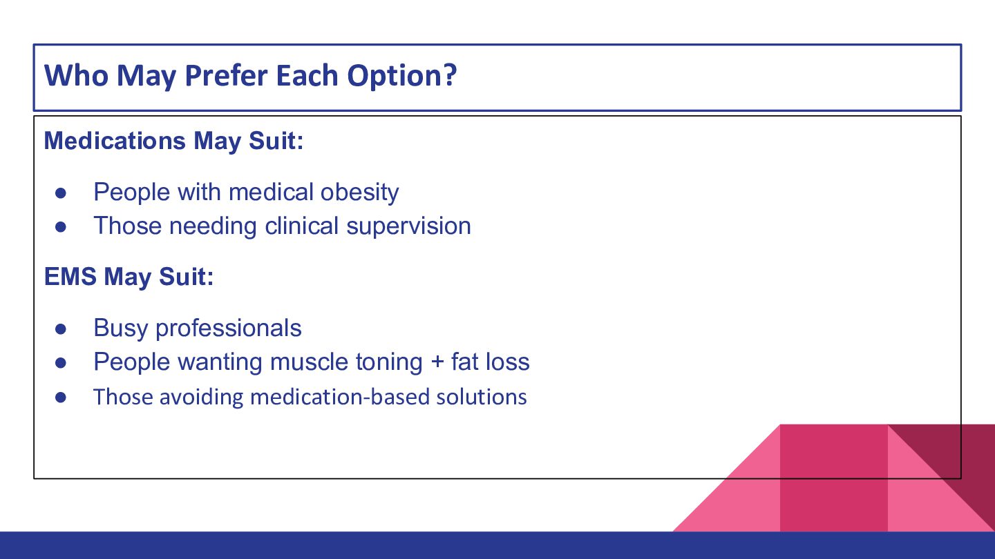 with medical obesity • Those needing clinical supervision EMS May Suit: • Busy professionals • People wanting muscle toning + fat loss • Those avoiding medication-based solutions