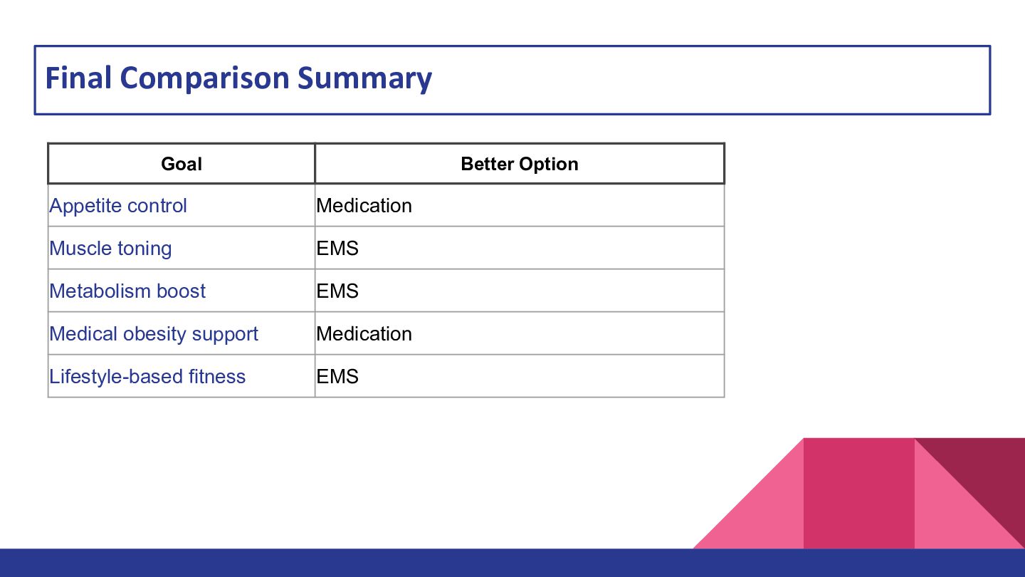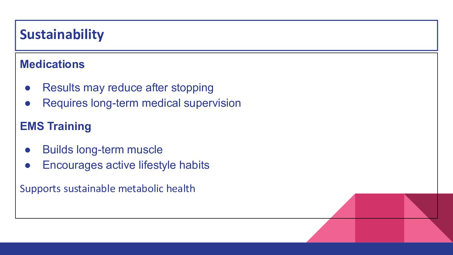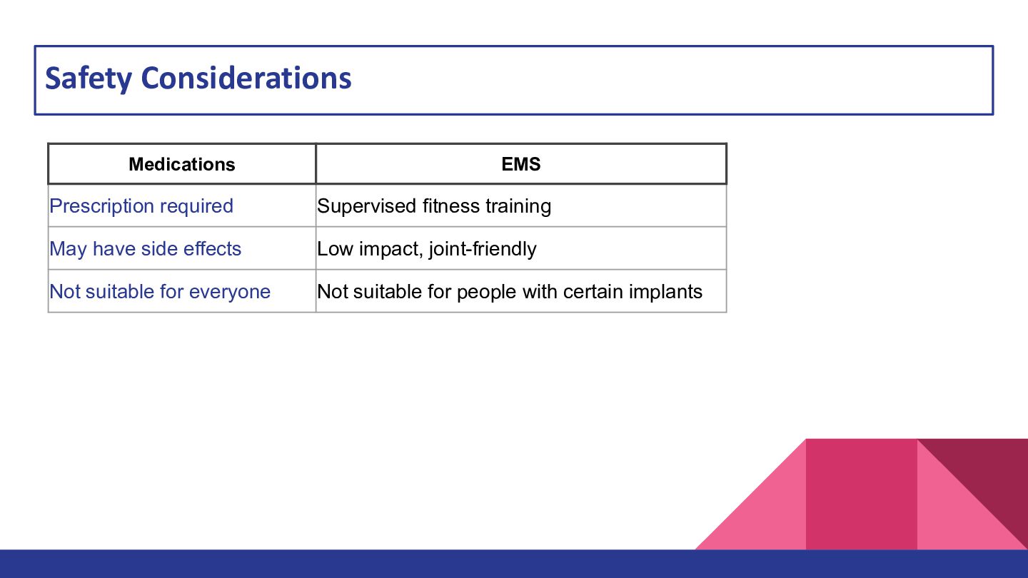 with medical obesity • Those needing clinical supervision EMS May Suit: • Busy professionals • People wanting muscle toning + fat loss • Those avoiding medication-based solutions