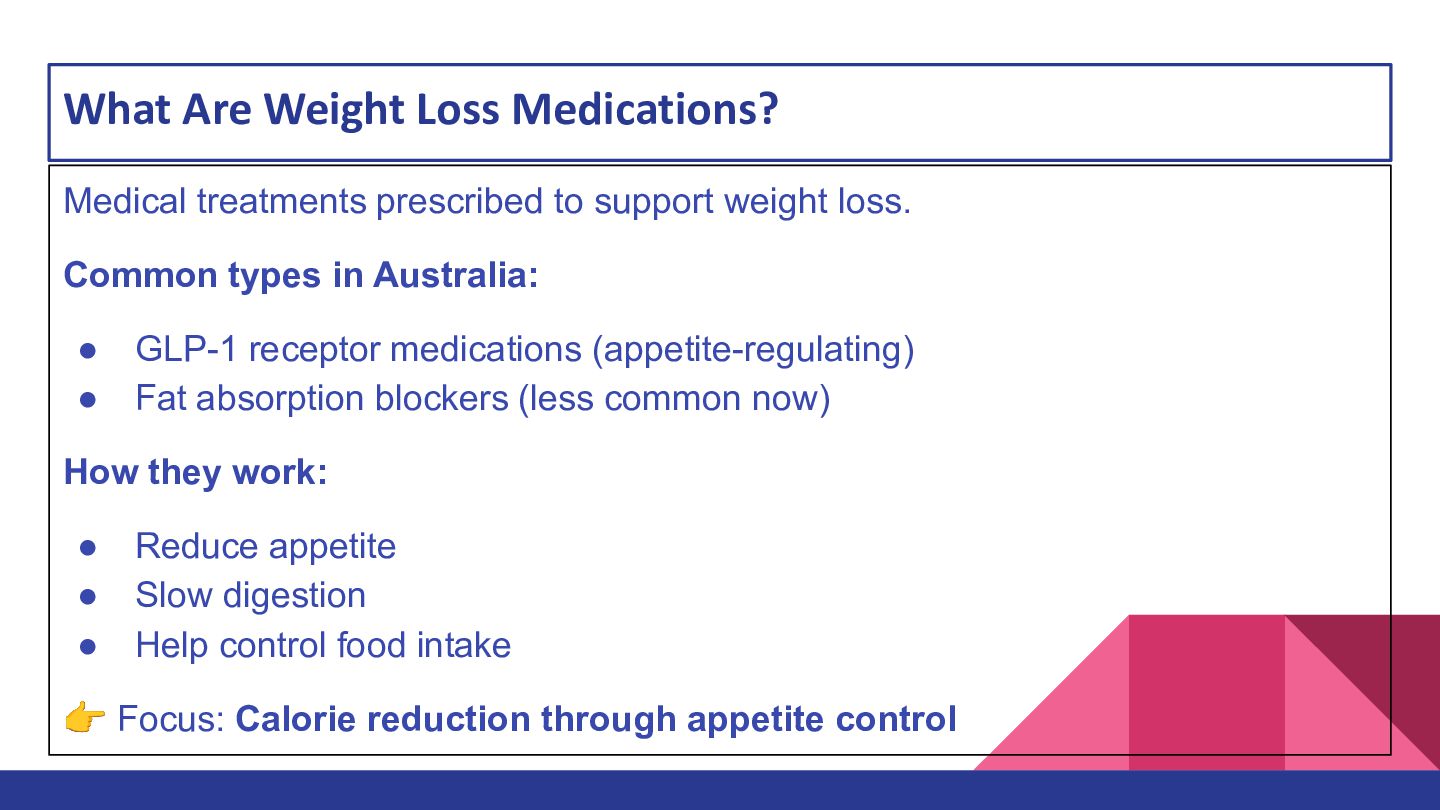 weight loss. Common types in Australia: • GLP-1 receptor medications (appetite-regulating) • Fat absorption blockers (less common now) How they work: • Reduce appetite • Slow digestion • Help control food intake 👉 Focus: Calorie reduction through appetite control