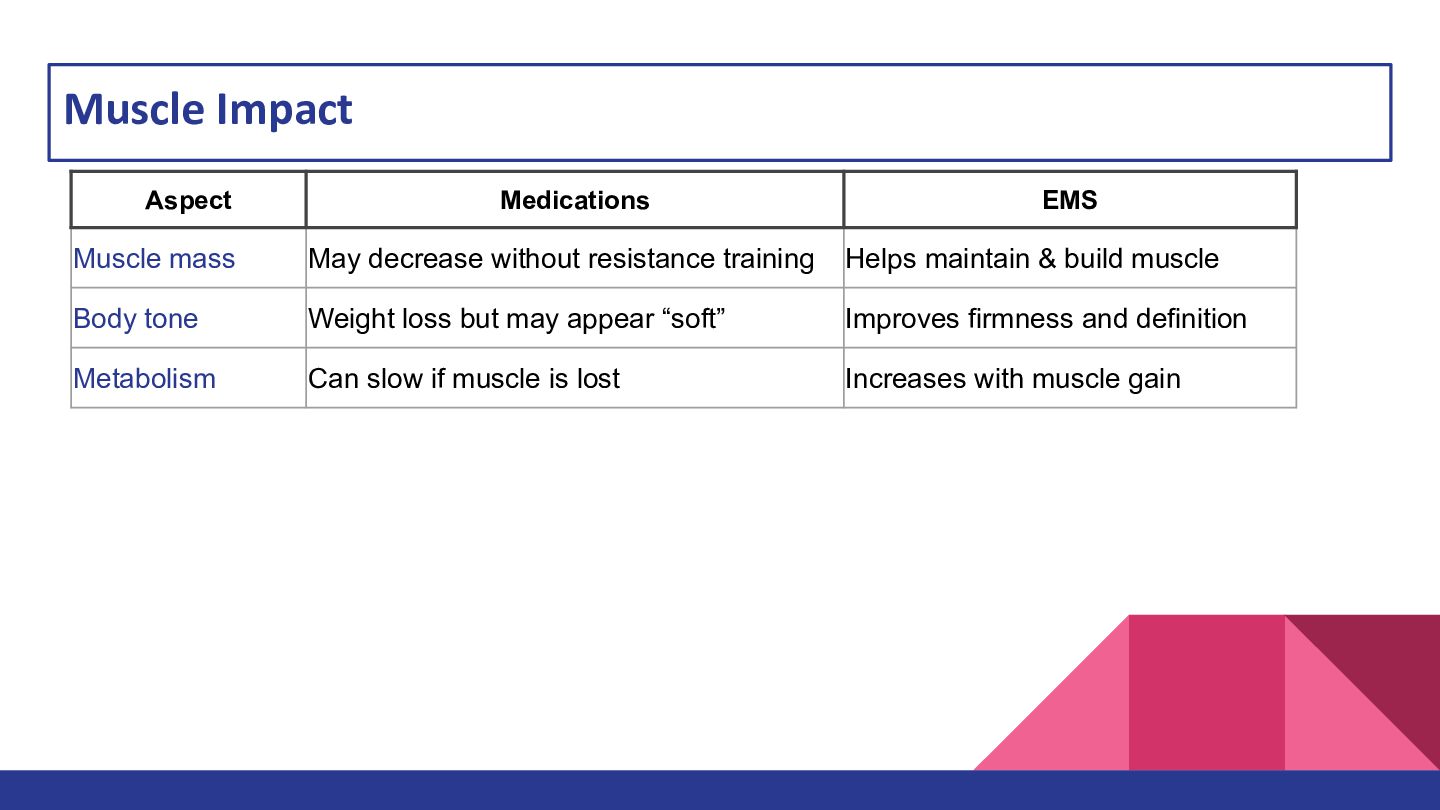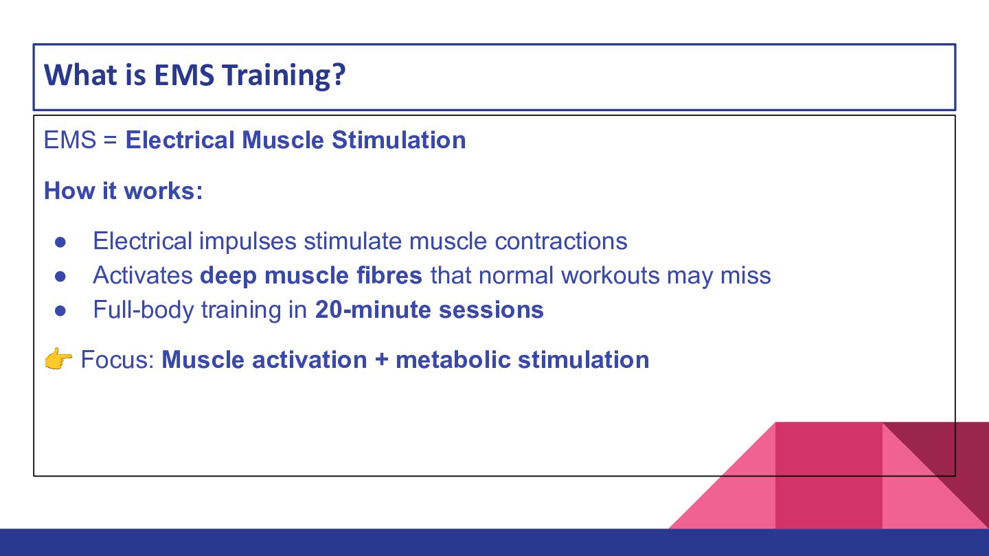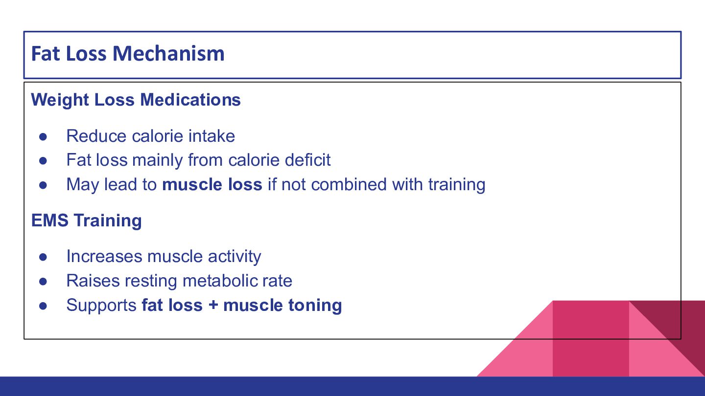 • Fat loss mainly from calorie deficit • May lead to muscle loss if not combined with training EMS Training • Increases muscle activity • Raises resting metabolic rate • Supports fat loss + muscle toning