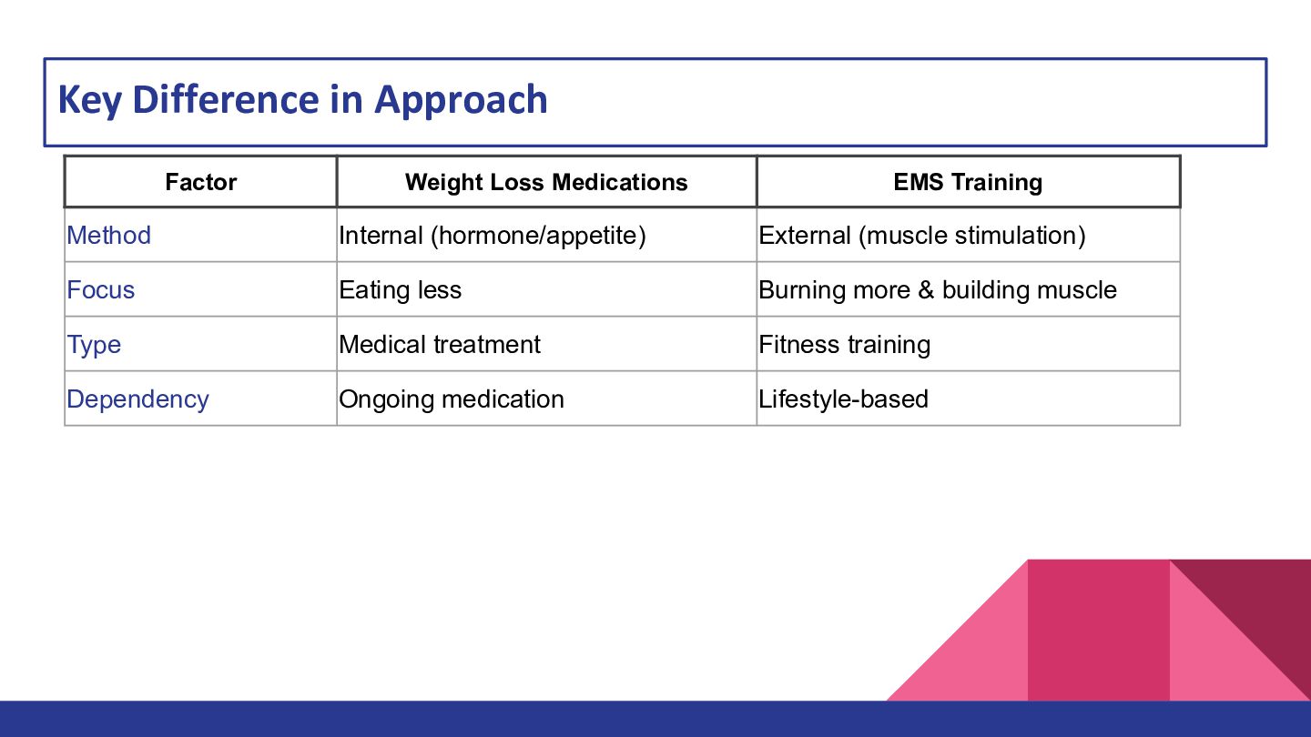 Method Internal (hormone/appetite) External (muscle stimulation) Focus Eating less Burning more & building muscle Type Medical treatment Fitness training Dependency Ongoing medication Lifestyle-based