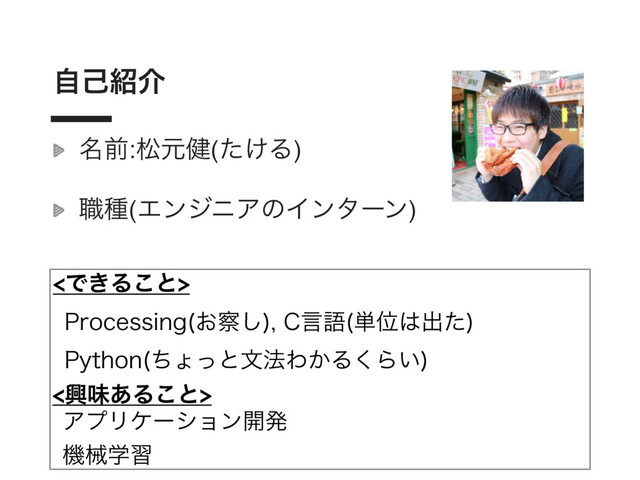 ໊લ:দݩ݈(͚ͨΔ) ৬छ(ΤϯδχΞͷΠϯλʔϯ) ࣗݾհ Ͱ͖Δ͜ͱ 1SPDFTTJOH ͓͠ $ݴޠ ୯Ґग़ͨ 1ZUIPO