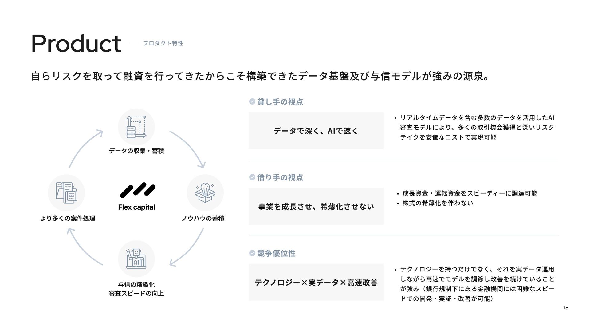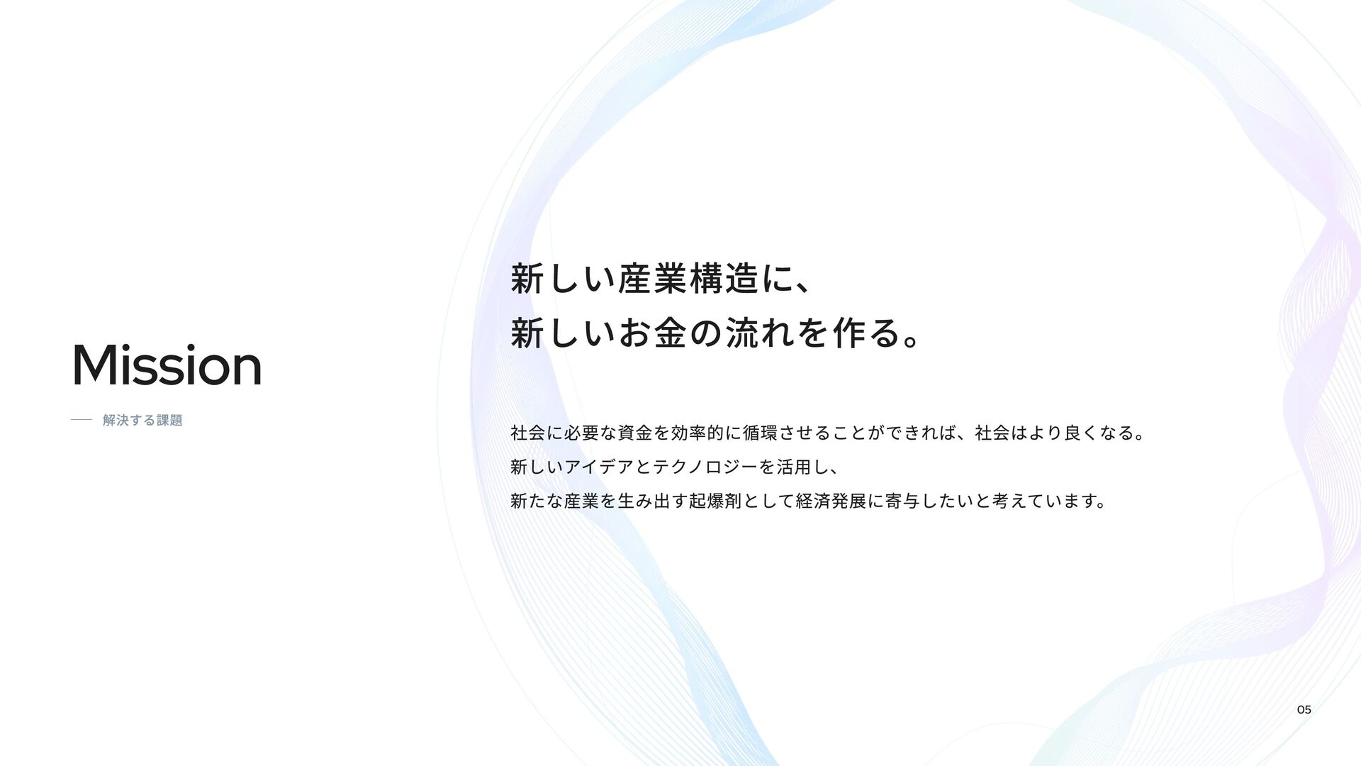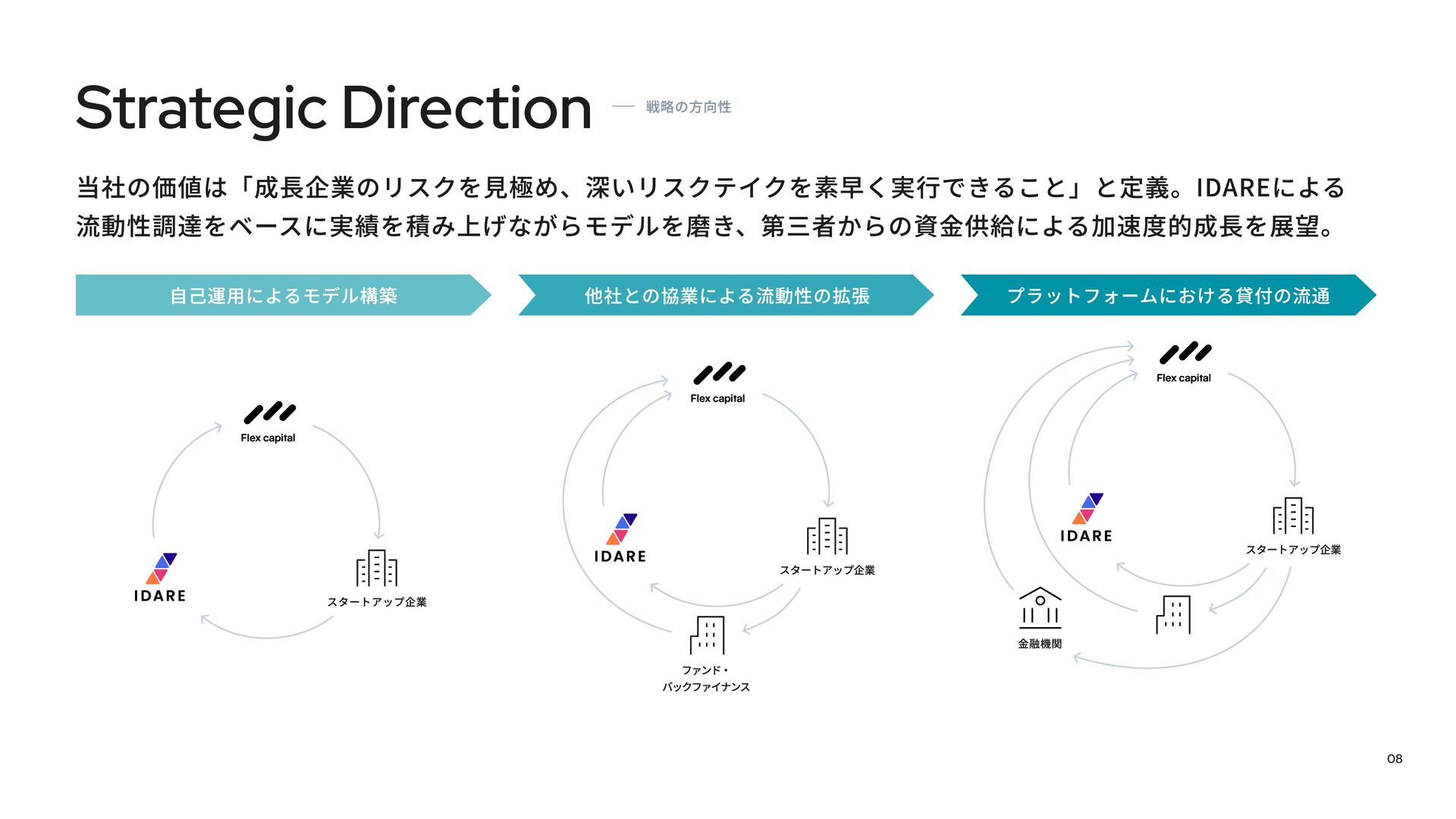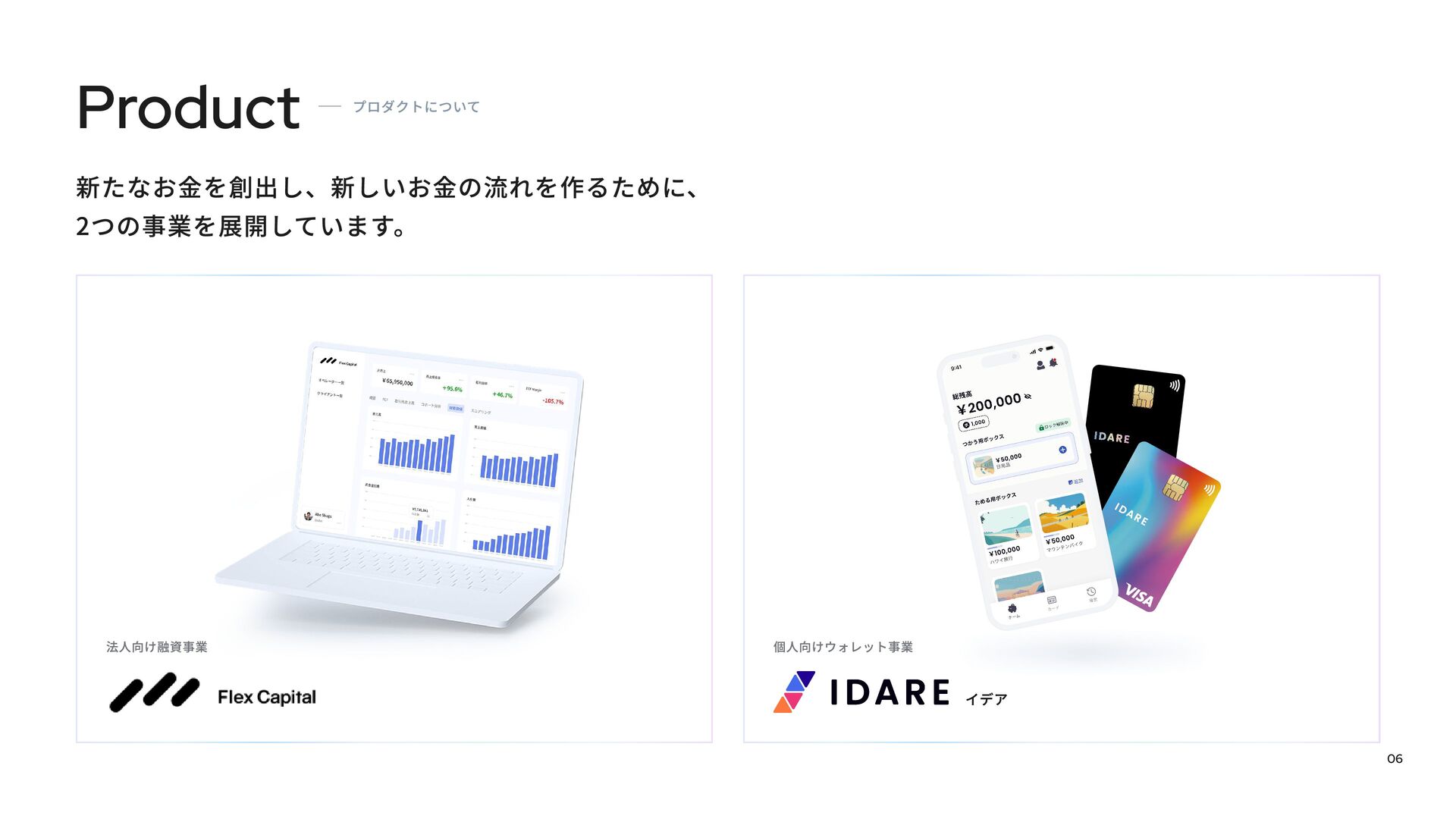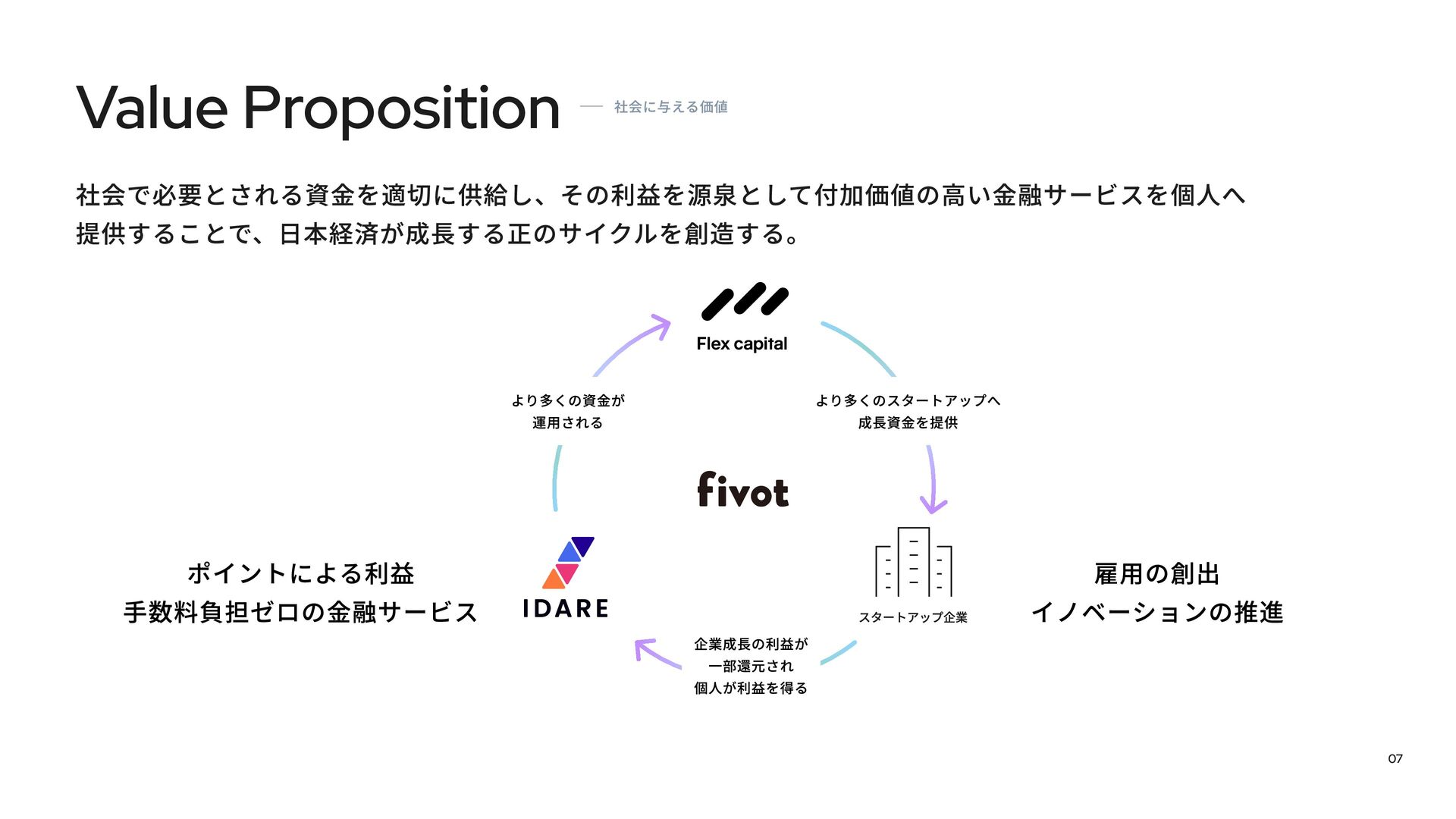 Fivotのカルチャーデックは、「新しい産業構造に、新しいお金の流れを作る。」という私たちのミッションをどのように実現しようとしているかを紹介しています。 スタートアップ向け融資事業「Flex Capital」と個人向けキャッシュレスアプリ「IDARE」のふたつのプロダクトを通じて、資金の流れをより効率的にし、新たな産業の成長を支えています。
