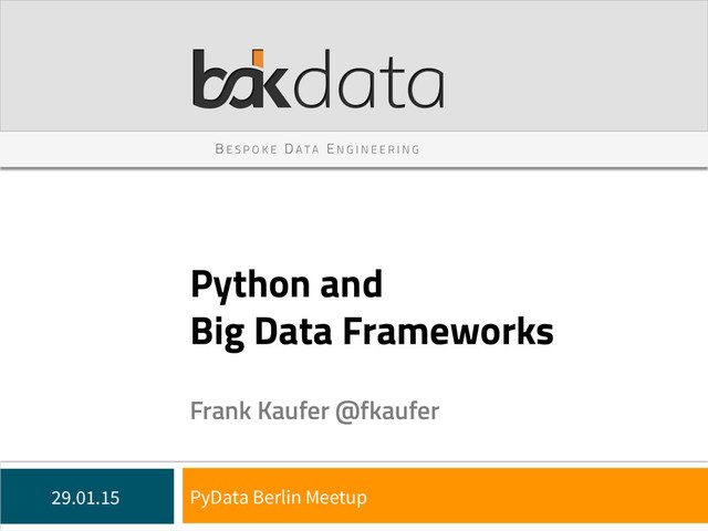 Talk on "Python and Big Data Frameworks" at the PyData Berlin Meetup (2015/01/29, http://www.meetup.com/PyData-Berlin/events/219668075/) giving a broad overview of approaches and technologies to build scalable data processing solutions using Python alone and in combination with Big Data frameworks like Hadoop, Spark, Impala, etc.