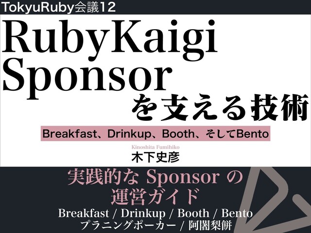 w ඞཁ͕͋Εɺεϙϯαʔۚͷࢧํ๏ɾࢧ࣌ظΛௐ͢Δ w ௨ৗ։࠵ޙͷٻ w %SJOLVQͳͲΛΔ߹͓ళͷͷࢧʹͳΔͨΊɺ3VCZ,BJHJӡ ӦνʔϜ͔ΒͷٻνέοτͷΈ 㾎 ԿεϙϯαʔΛΔͷ͔ΛܾΊΔ w ΈΜͳͰҙݟΛग़ܾͯ͠ΊΔ w ސͱ૬ஊ͢Δ 㾎 औΓஔ͖ͯ͠Β͏νέοτͷຕΛ࿈བྷ͢Δ w औΓஔ͖ຕΛࣾͰ֬ೝ͢Δ 㾎 εϙϯαʔͷೖํ๏Λ֬ೝͯ͠ɺࣾͷࢀՃऀʹҊ͢Δ 㾎 ٻॻ͕ૹΒΕ͖ͯͨΒɺεϙϯαʔۚΛࢧ͏ 㾎 ͔͔ͬͨܦඅਫ਼ࢉΛਫ਼ࢉ͢Δʢࣾखଓ͖ʣ 㾎 ;Γ͔͑ΓΛ͢Δʢࣾʣ %SJOLVQ#SFBLGBTU 㾎 %SJOLVQ#SFBLGBTUͷձΛௐΔ w ֬ೝ͢Δ͜ͱɿਓɺձ͔ΒͷΞΫηεɺຊञΛ࣋ͪࠐΈՄೳ͔ w 0⒏DJBM1BSUZͷఔͱॏͳΒͳ͍Α͏ʹ3VCZ,BJHJӡӦνʔϜͱ࿈ܞ͓ͯ͘͠ w ͷ#SFBLGBTUͷΑ͏ʹ3VCZ,BJHJͱಉ͡ձΛ͏߹3VCZ,BJHJӡӦνʔ Ϝͱͷ࿈ܞΛಛʹ໖ີʹ 㾎 %SJOLVQ#SFBLGBTUͷձΛԼݟ͢Δ w Լݟ3VCZ,BJHJ։࠵ʹࡏॅ͍ͯ͠Δ3VCZJTUʹಉߦͯ͠Β͏ w 3VCZ,BJHJӡӦνʔϜ͔Βհͯ͠Β͏ 㾎 %SJOLVQ#SFBLGBTUͷձΛ༧͢Δ 㾎 ຊञεʔύʔόΠβʔʹΦϑΝʔ͢Δ 㾎 ຊञεʔύʔόΠβʔʹຊञͷબఆΛґཔ͢Δ 㾎 %PPSLFFQFSͰࢀՃऀΛืू͢Δ w ݸਓใͷऩूʹ͍ͭͯͷࣾ֬ೝ 㾎 ձࣾͷϗʔϜϖʔδͰࠂ͢Δ 㾎 3VCZ,BJHJͷϗʔϜϖʔδʹ%SJOLVQͷใΛܝࡌͯ͠Β͏ 㾎 ຊञΛൃ͢Δ w ͓ళͷड͚औΓͱิͷ͓ئ͍Εͣʹ 㾎 ࢀՃऀʹ͢ΔγʔϧΛ४උ͢Δ 㾎 ɺࢀՃऀʹγʔϧΛΔ w ͳ͘ͳͬͨγʔϧͷຕͰࢀՃਓ͕ѲͰ͖Δ ϒʔε 㾎 εϙϯαʔϒʔεͷग़͠ΛܾΊΔ w ৯ΛΔ߹࣋ͪࠐΈՄೳ͔Ͳ͏͔Λ3VCZ,BJHJӡӦνʔϜʹ֬ೝ͢Δ 㾎 ϒʔεͷ০ΛσβΠϯ͢Δ w ொా͞Μʹ૬ஊ͢Δ 㾎 ϒʔεͷ০Λൃ͢Δ 㾎 ϊϕϧςΟΛ੍࡞ͯ͘͠ΕΔձࣾΛ୳͢ 㾎 ϊϕϧςΟͷσβΠϯΛ͢Δ w ொా͞Μʹ૬ஊ͢Δ 㾎 ϊϕϧςΟΛ੍࡞ձࣾʹൃ͢Δ 㾎 ϑϥΠϠʔͷҹΛൃ͢Δ 㾎 ϒʔεग़లਃใΛ3VCZ,BJHJӡӦνʔϜʹૹΔ w లࣔ༰ɺҿ৯ͷऔΓѻ͍ɺలࣔύεͷඞཁຕΛ࿈བྷ͢Δ 㾎 εϙϯαʔϒʔεʹஔ͘ՙΛൃૹ͢Δ w ൃૹ͢ΔՙͷҰཡΛ࡞͢Δ w -5Ͱ͏ಔᮐҰॹʹൃૹ͢Δ 㾎 ϒʔεͷϨΠΞτΛࣄલʹγϛϡϨʔγϣϯ͓ͯ͘͠ 㾎 ձظॳʹϒʔεʹలࣔ͢ΔͷΛฒΔ 㾎 ձظதɺϒʔεରԠΛ͢Δ 㾎 ϊϕϧςΟͷྔͳͲదٓ5XJUUFSͳͲʹใൃ৴͢Δ w ۙ͝ॴͷϒʔεͰͲΒম͖͕༨͍ͬͯͯࠔ͍ͬͯͦ͏ͩͬͨΒɺએΛڠྗ͢Δ 㾎 ձظॳʹϒʔεΛఫऩ͢Δ w ՙࢦఆͷूੵॴʹ͍࣋ͬͯ͘ w ศͷථʢૹΓओ༻ʣΓऔΒͣʹɺࣸਅΛࡱ͓ͬͯ͘ ห 㾎ΦϦδφϧͷᗌేࢴΛ͚ͭΒΕΔ͔Ͳ͏͔Λ֬ೝ͢Δ w ᗌేࢴΛ͚ͭΒΕΔ߹αΠζΛ֬ೝ͢Δ 㾎ᗌేࢴΛσβΠϯ͢Δ 㾎ᗌేࢴΛҹ͢Δ 㾎ᗌేࢴΛࢦఆઌʹൃૹ͢Δ w ҹͨ͠ͷΛ͓หۀऀ͞Μʹ͢ 㾎ձظதɺหͷΛख͏ 3VCZ,BJHJπΞʔ 㾎 3VCZ,BJHJπΞʔͷࢀՃऀΛืू͢Δ w ݸਓใͷऩूʹ͍ͭͯͷࣾ֬ೝ 㾎 3VCZ,BJHJπΞʔͷࢀՃऀΛܾΊͯɺࢀՃํ๏ܦඅͷਫ਼ࢉํ๏ʹ͍ͭͯҊ͢Δ 㾎 ձظதɺ3VCZ,BJHJπΞʔͷࢀՃऀͱͪ߹Θͤͯϥϯν͢Δ %SJOLVQ %SJOLVQҎ֎