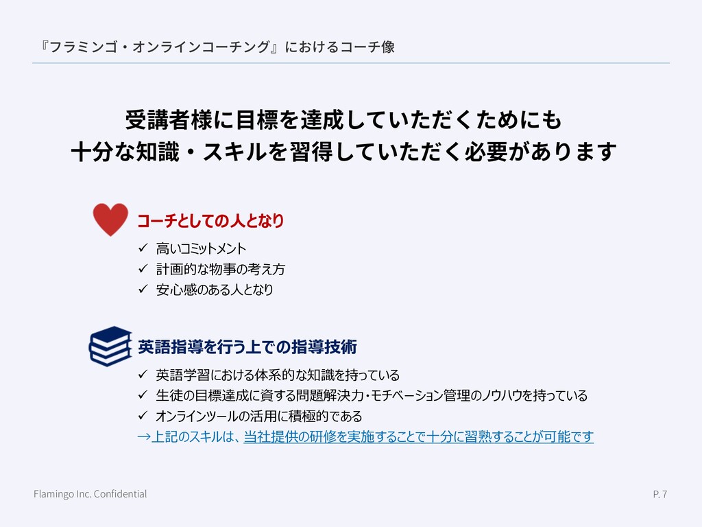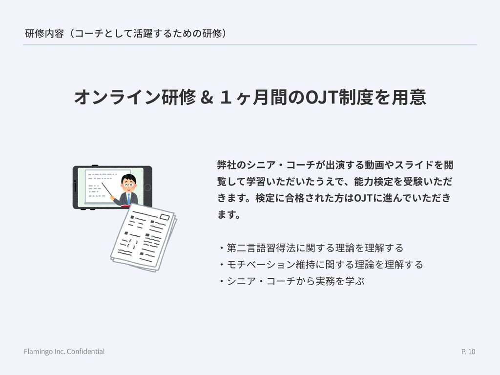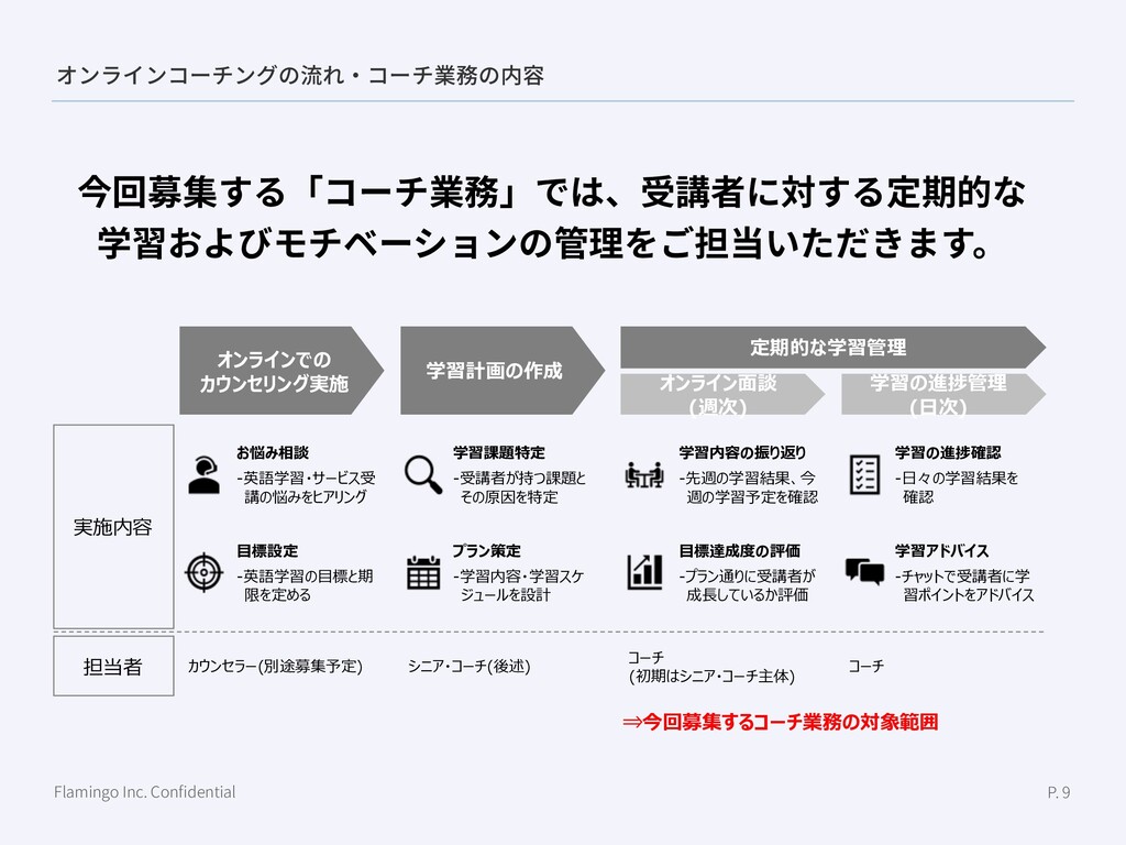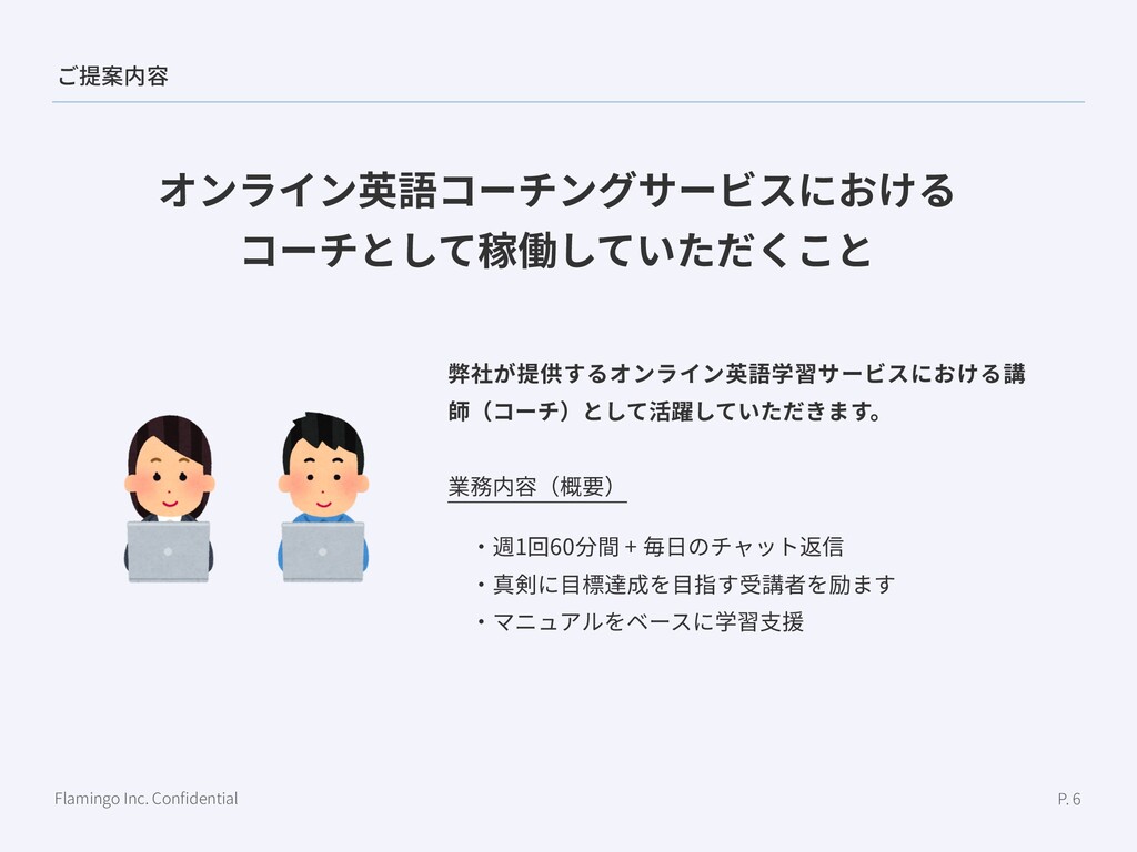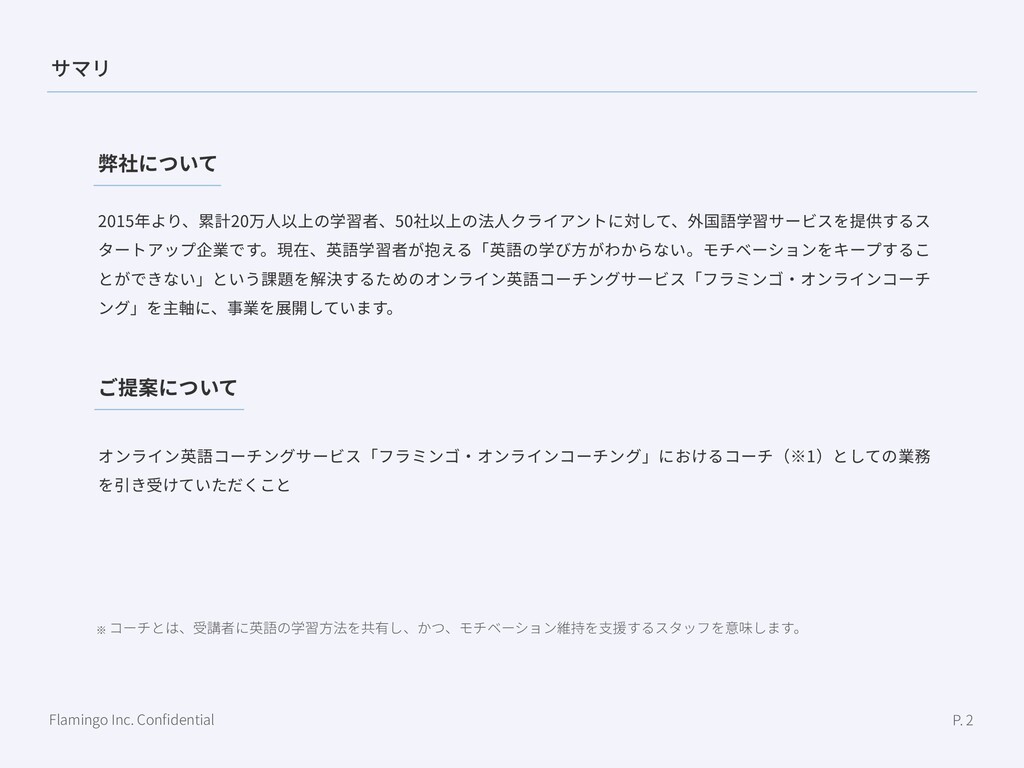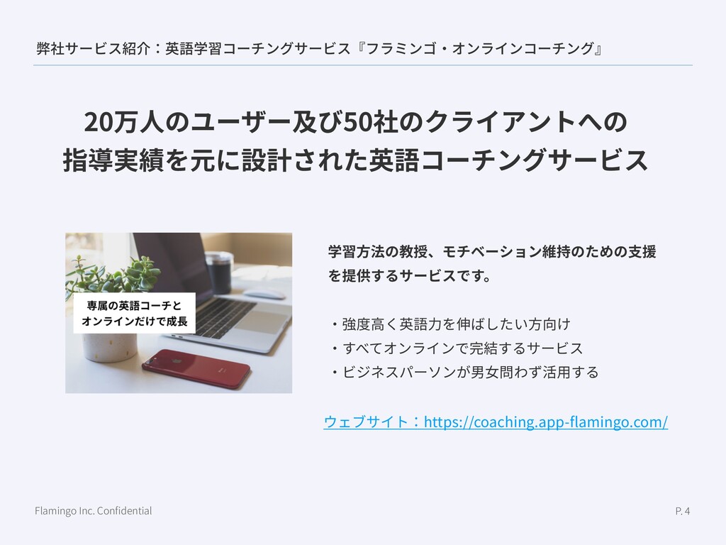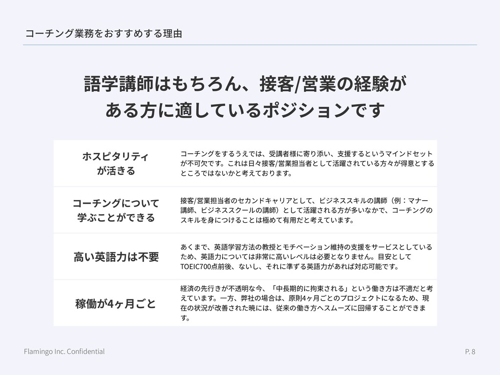 弊社は、2015年より、累計20万人以上の学習者、50社以上の法人クライアントに対して、外国語学習サービスを提供するスタートアップ企業です。現在、英語学習者が抱える「英語の学び方がわからない。モチベーションをキープすることができない」という課題を解決するためのオンライン英語コーチングサービス「フラミンゴ・オンラインコーチング」を主軸に、事業を展開しています。当該資料は、そのサービスで活躍いただくコーチの方についての求人情報を掲載した資料です。