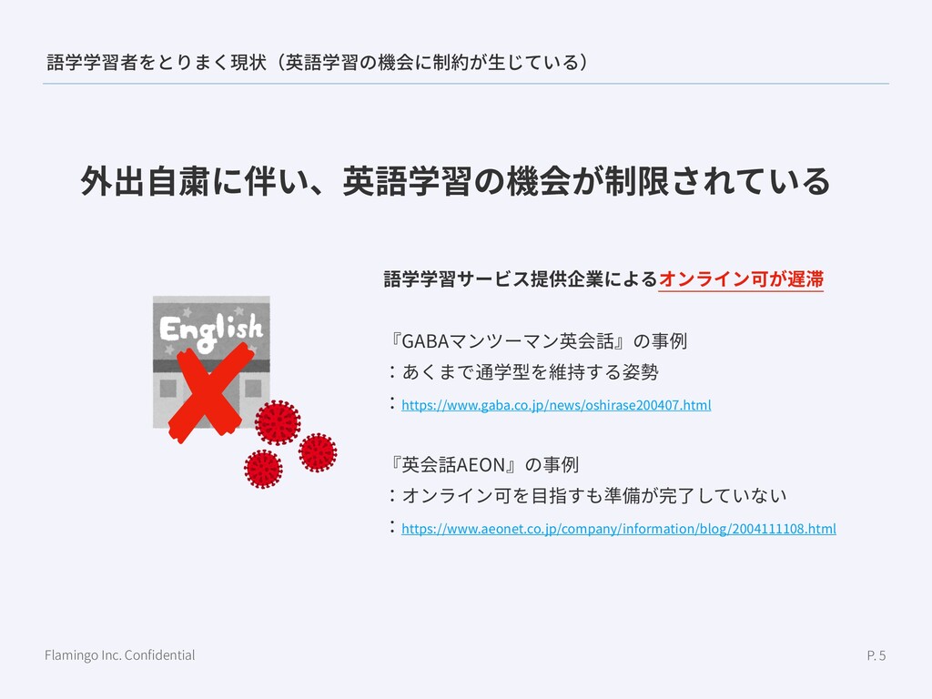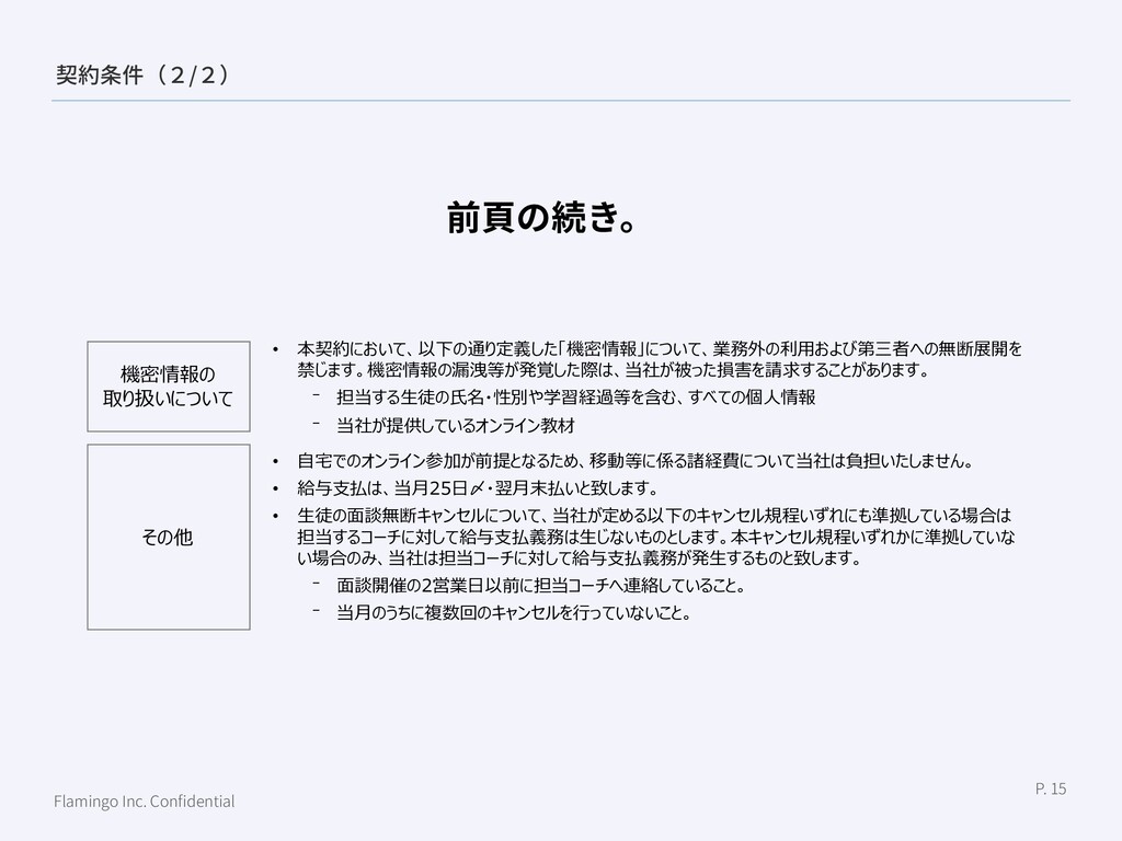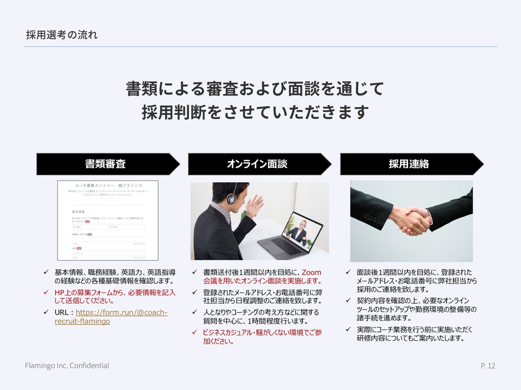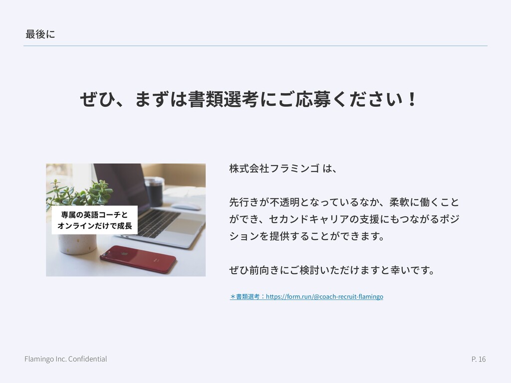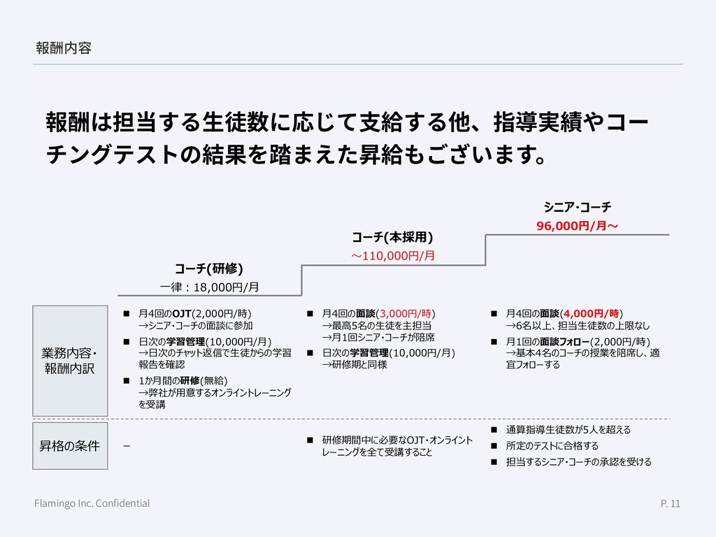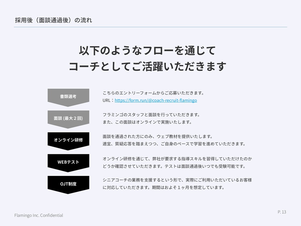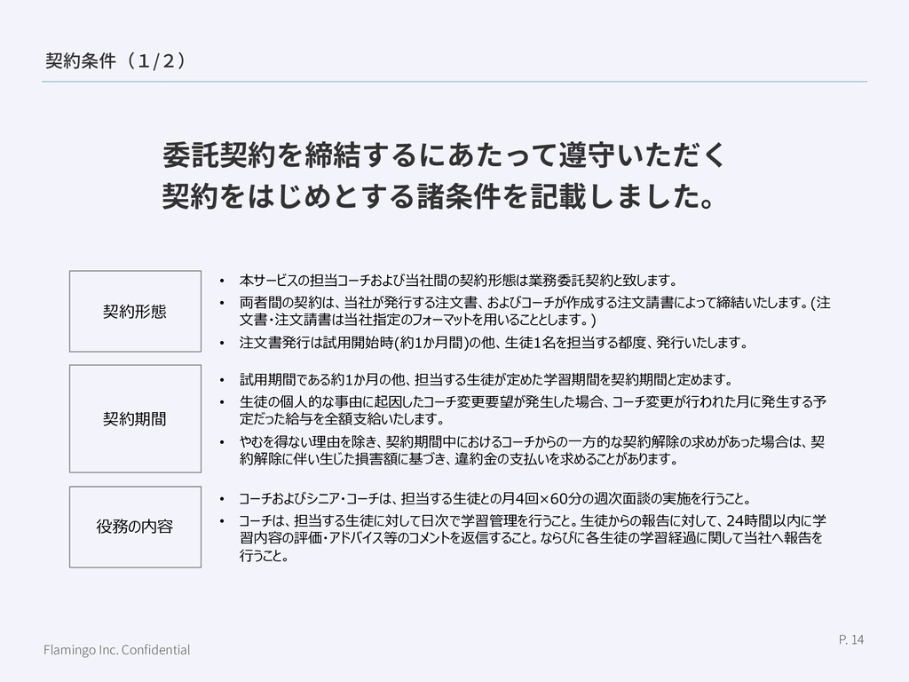 弊社は、2015年より、累計20万人以上の学習者、50社以上の法人クライアントに対して、外国語学習サービスを提供するスタートアップ企業です。現在、英語学習者が抱える「英語の学び方がわからない。モチベーションをキープすることができない」という課題を解決するためのオンライン英語コーチングサービス「フラミンゴ・オンラインコーチング」を主軸に、事業を展開しています。当該資料は、そのサービスで活躍いただくコーチの方についての求人情報を掲載した資料です。