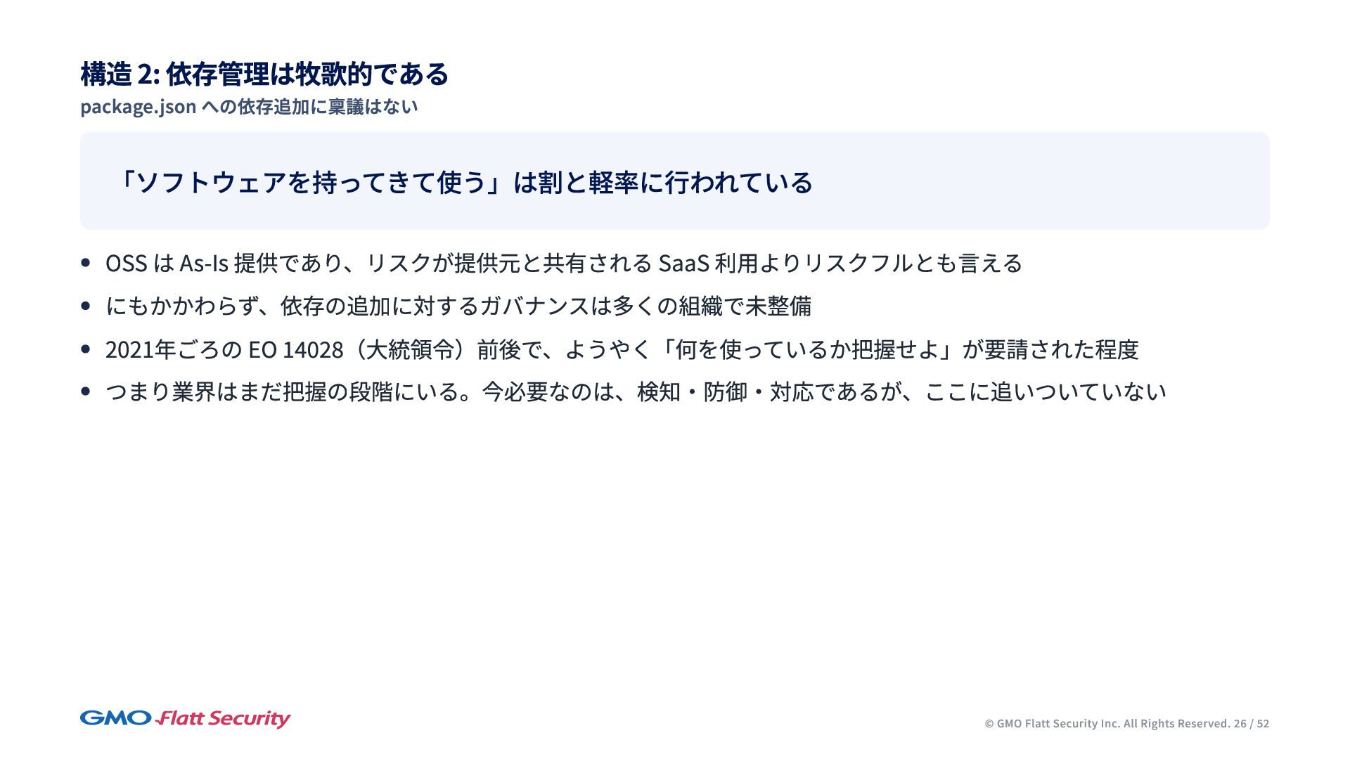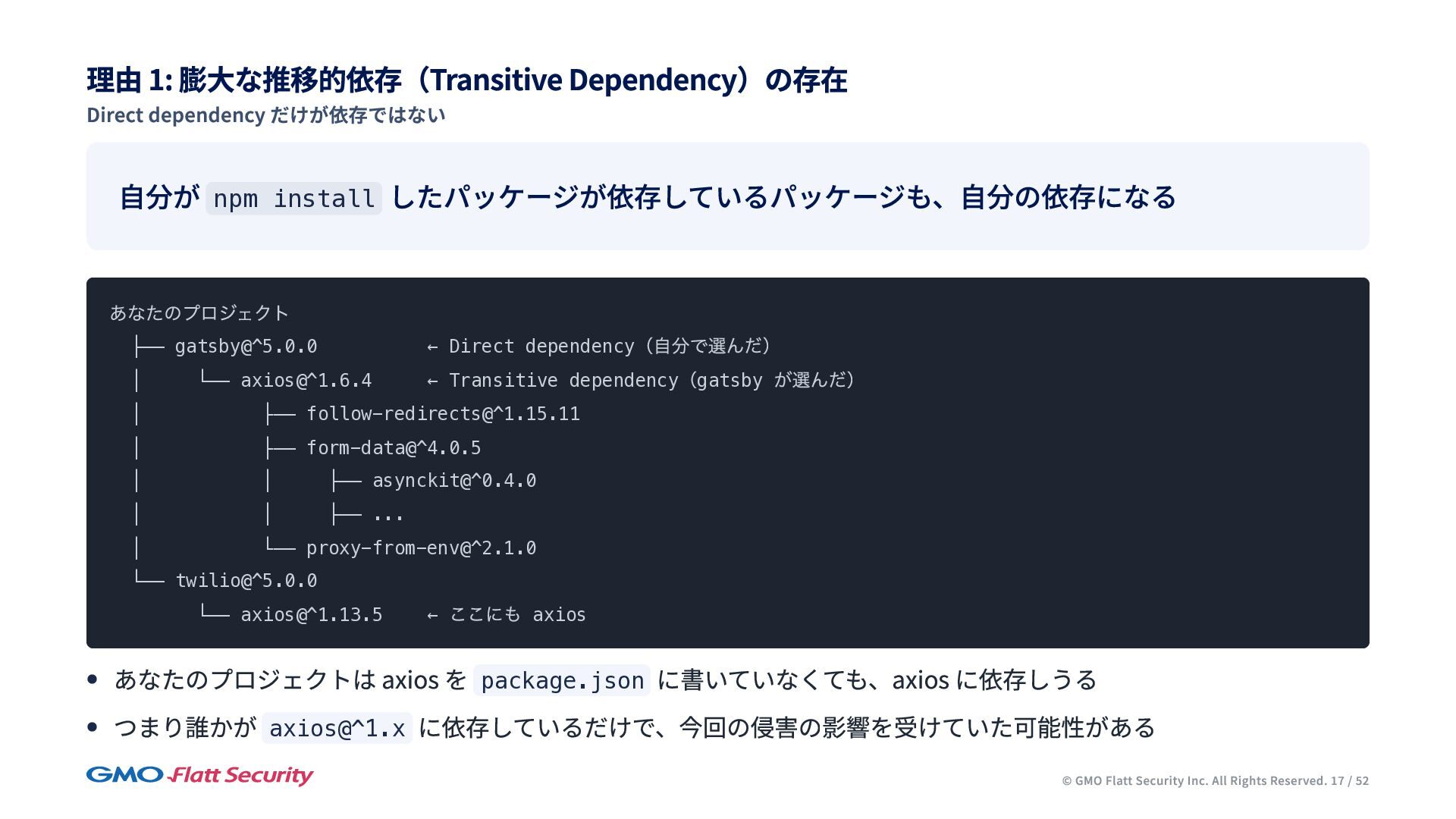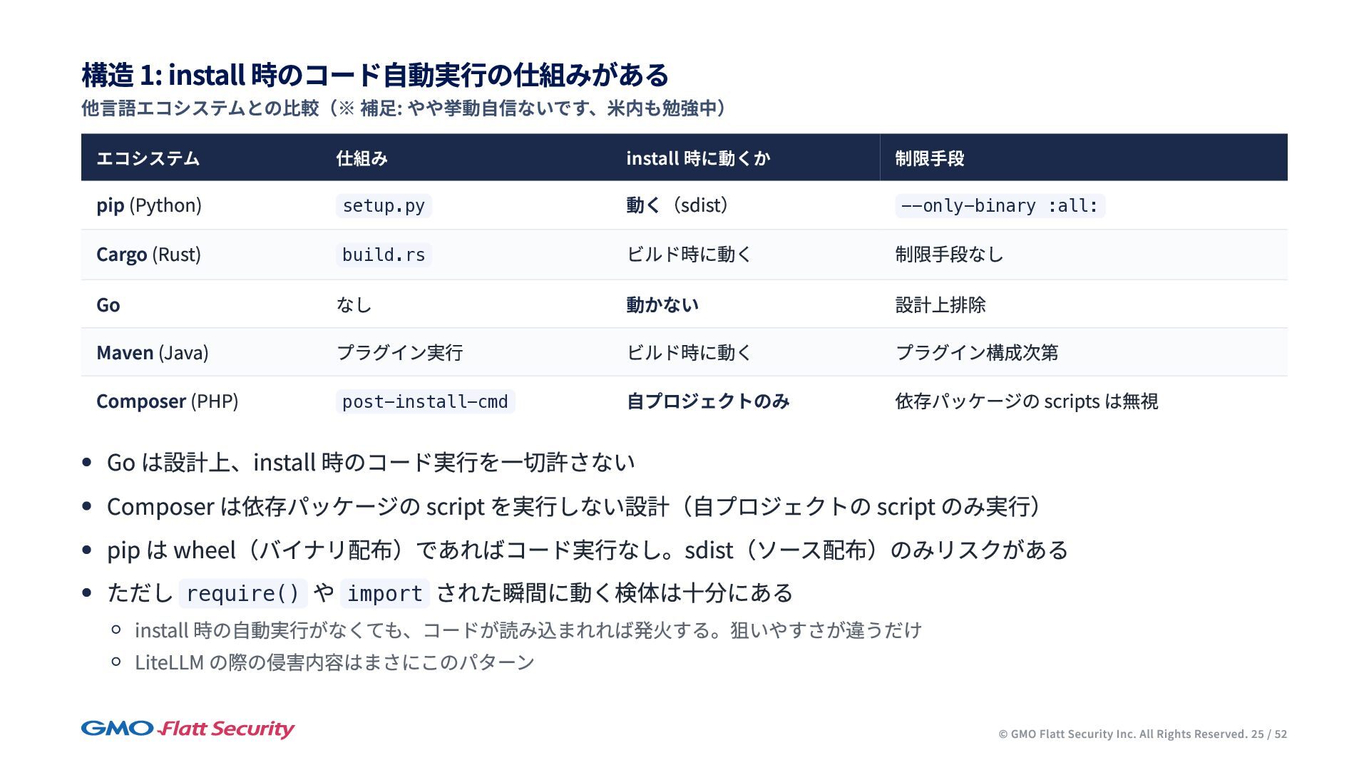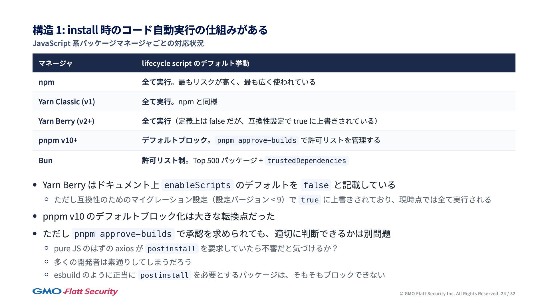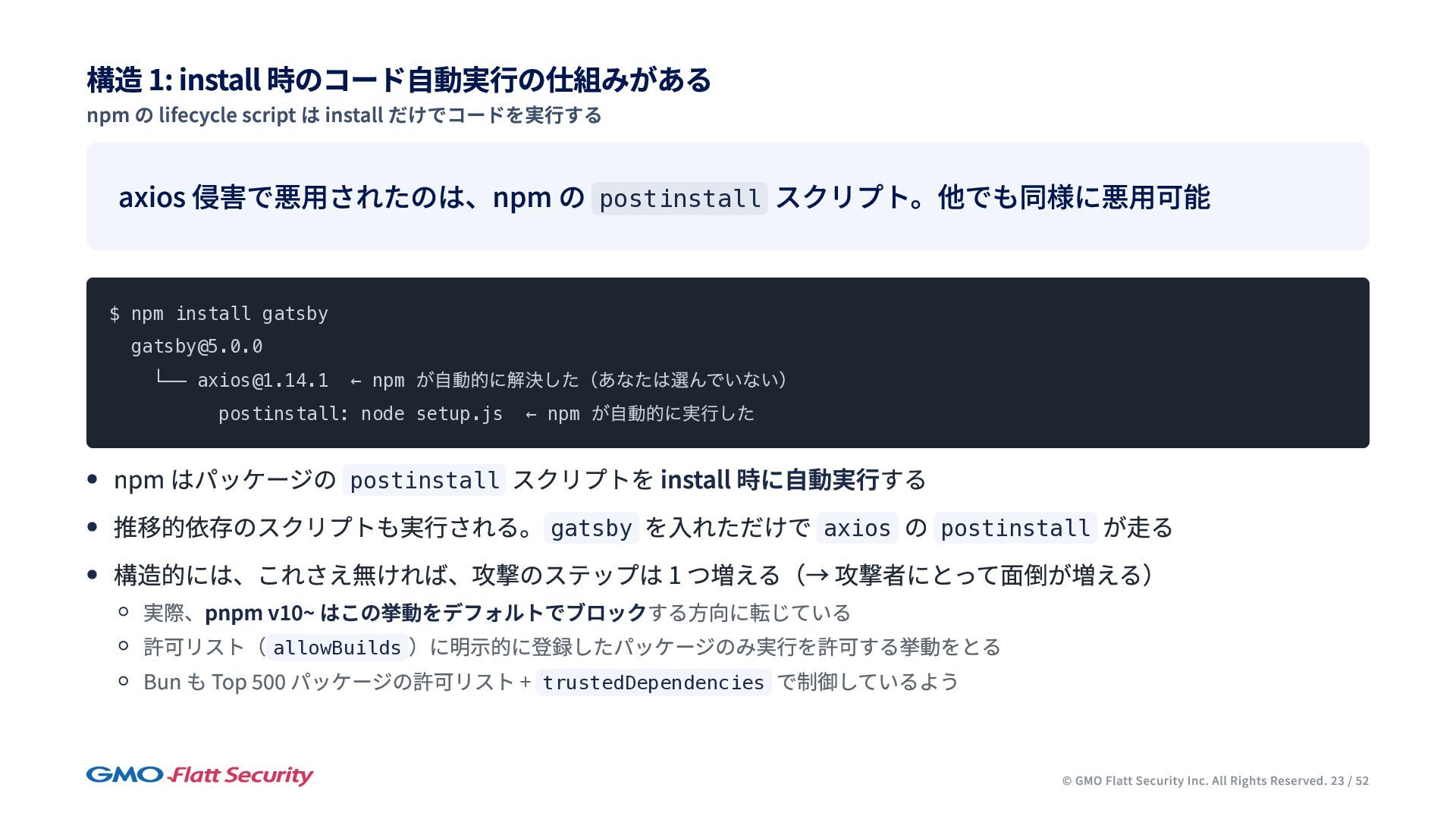 [email protected] ← npm が自動的に解決した(あなたは選んでいない) postinstall: node setup.js ← npm が自動的に実行した npm はパッケージの postinstall スクリプトを install 時に自動実行する 推移的依存のスクリプトも実行される。gatsby を入れただけで axios の postinstall が走る 構造的には、これさえ無ければ、攻撃のステップは 1 つ増える(→ 攻撃者にとって面倒が増える) 実際、pnpm v10~ はこの挙動をデフォルトでブロックする方向に転じている 許可リスト( allowBuilds )に明示的に登録したパッケージのみ実行を許可する挙動をとる Bun も Top 500 パッケージの許可リスト + trustedDependencies で制御しているよう 構造 1: install 時のコード自動実行の仕組みがある © GMO Flatt Security Inc. All Rights Reserved. 23 / 52