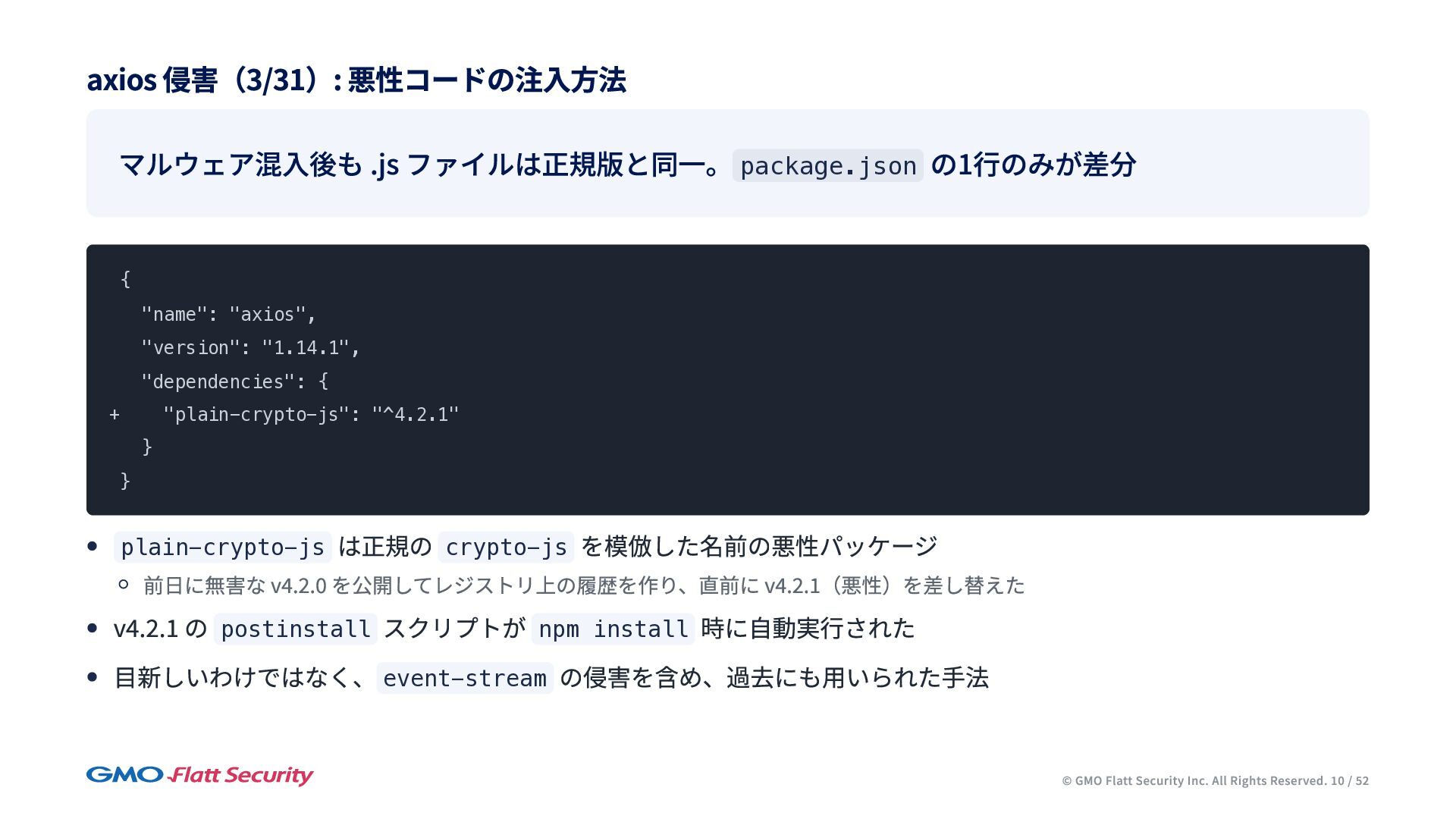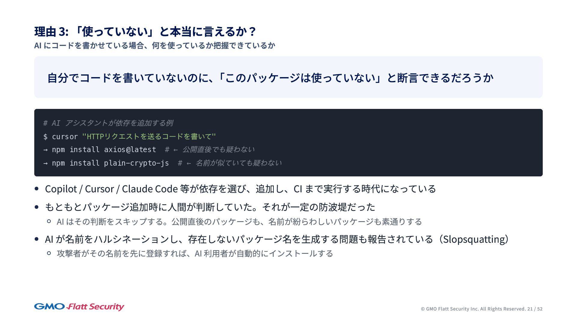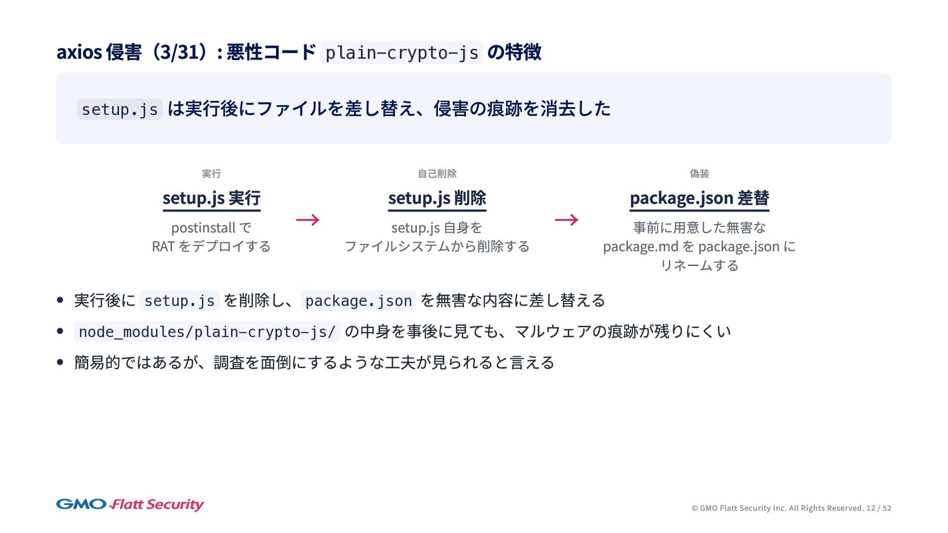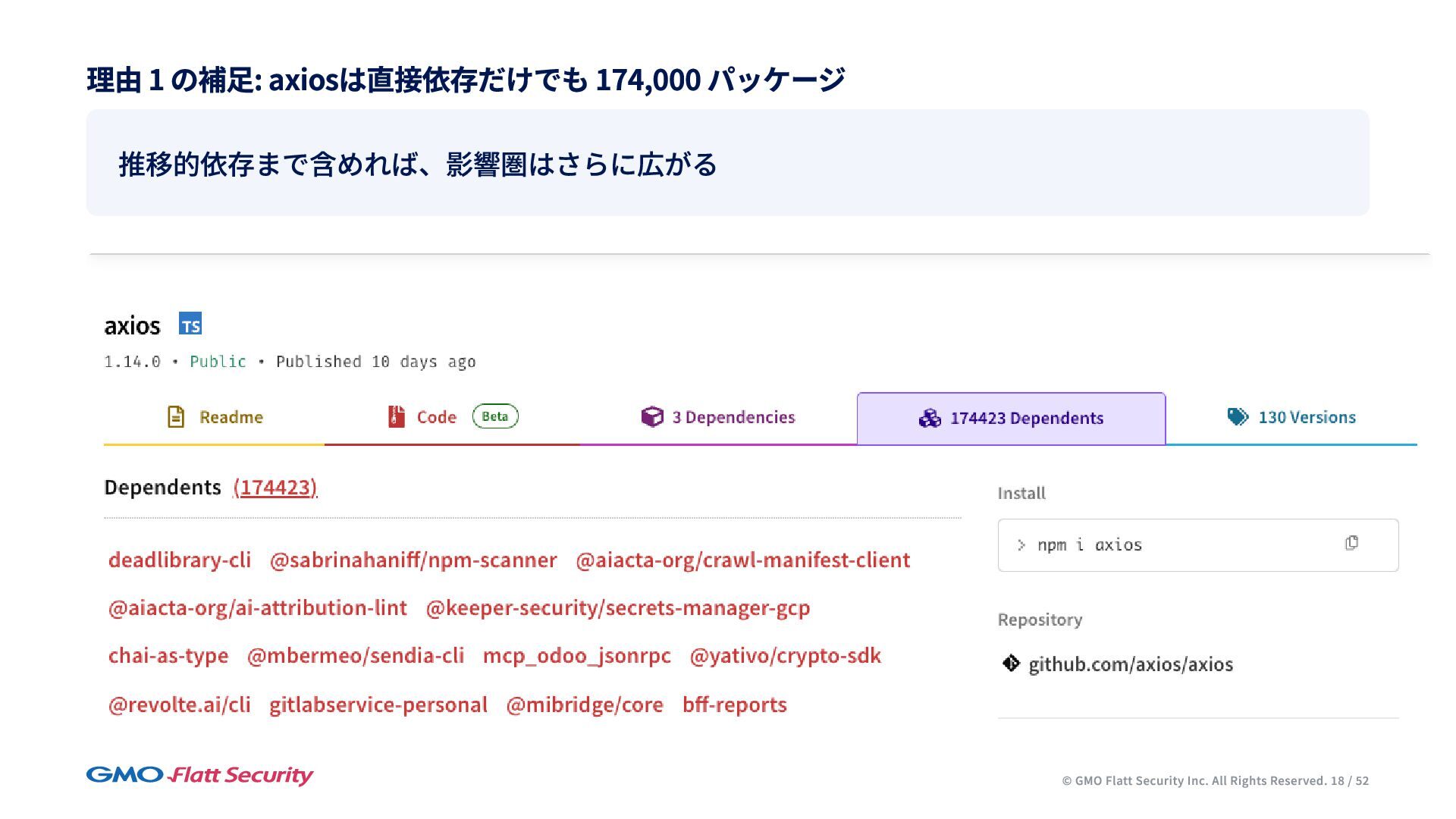 [email protected] ← npm が自動的に解決した(あなたは選んでいない) postinstall: node setup.js ← npm が自動的に実行した npm はパッケージの postinstall スクリプトを install 時に自動実行する 推移的依存のスクリプトも実行される。gatsby を入れただけで axios の postinstall が走る 構造的には、これさえ無ければ、攻撃のステップは 1 つ増える(→ 攻撃者にとって面倒が増える) 実際、pnpm v10~ はこの挙動をデフォルトでブロックする方向に転じている 許可リスト( allowBuilds )に明示的に登録したパッケージのみ実行を許可する挙動をとる Bun も Top 500 パッケージの許可リスト + trustedDependencies で制御しているよう 構造 1: install 時のコード自動実行の仕組みがある © GMO Flatt Security Inc. All Rights Reserved. 23 / 52