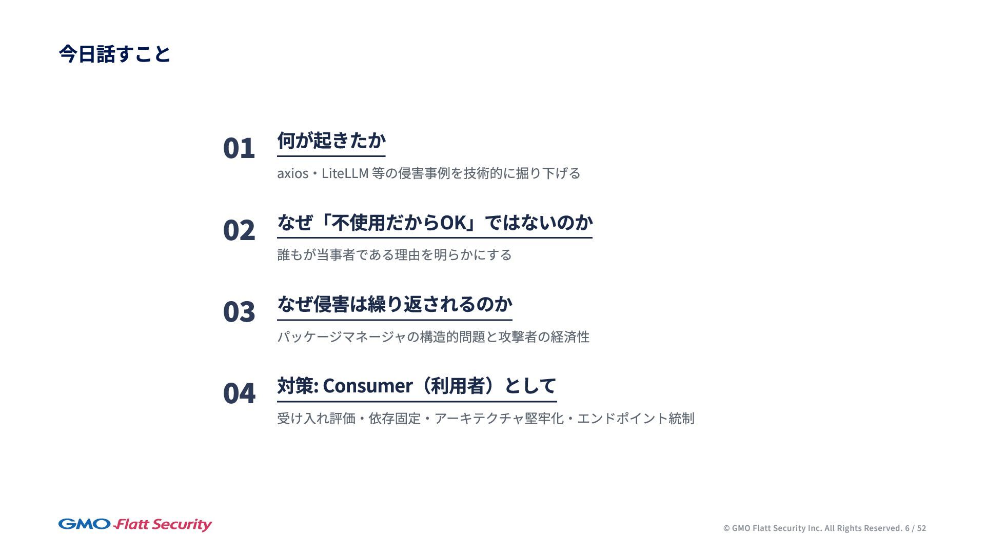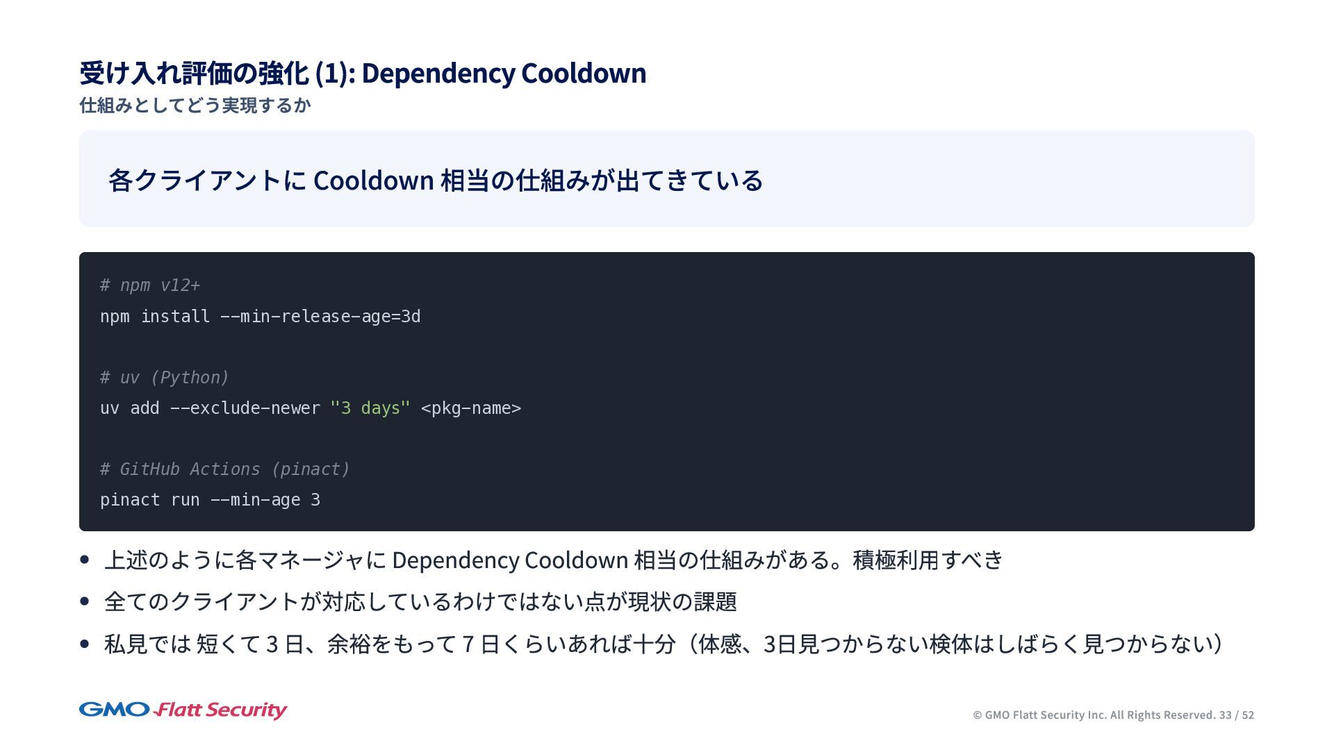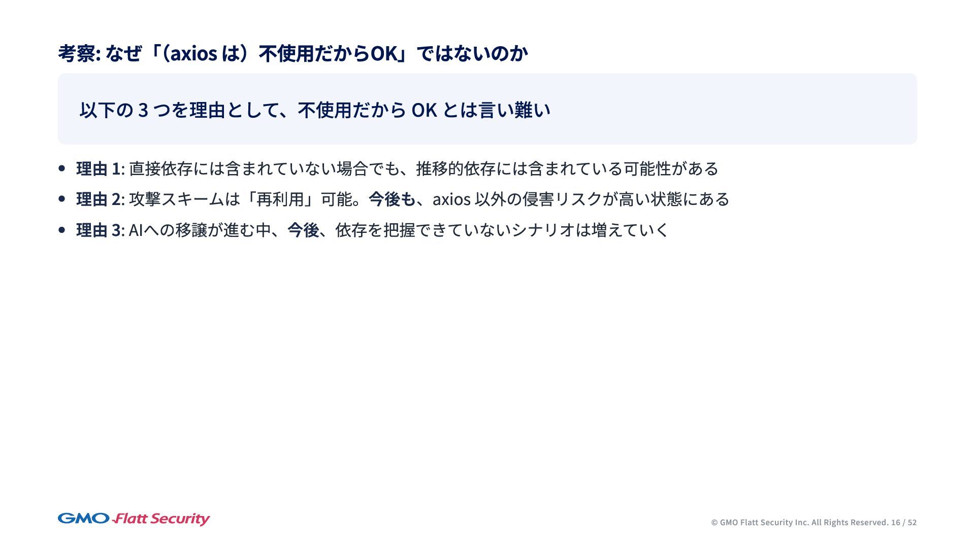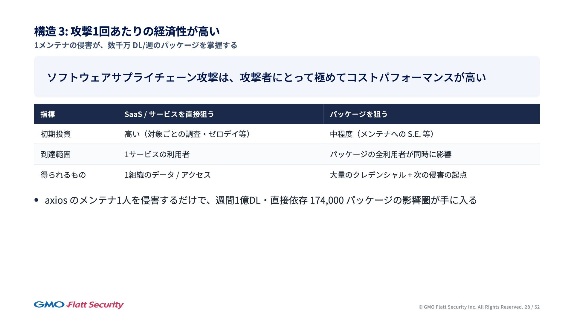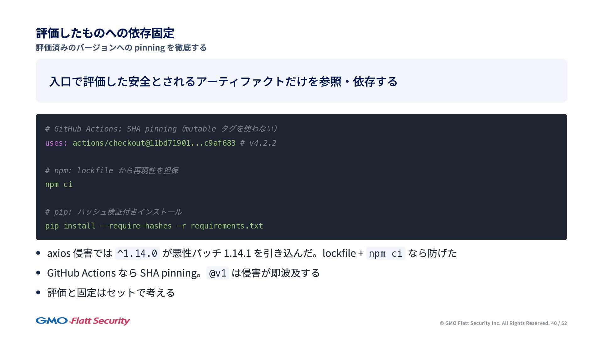[email protected] ← npm が自動的に解決した(あなたは選んでいない) postinstall: node setup.js ← npm が自動的に実行した npm はパッケージの postinstall スクリプトを install 時に自動実行する 推移的依存のスクリプトも実行される。gatsby を入れただけで axios の postinstall が走る 構造的には、これさえ無ければ、攻撃のステップは 1 つ増える(→ 攻撃者にとって面倒が増える) 実際、pnpm v10~ はこの挙動をデフォルトでブロックする方向に転じている 許可リスト( allowBuilds )に明示的に登録したパッケージのみ実行を許可する挙動をとる Bun も Top 500 パッケージの許可リスト + trustedDependencies で制御しているよう 構造 1: install 時のコード自動実行の仕組みがある © GMO Flatt Security Inc. All Rights Reserved. 23 / 52