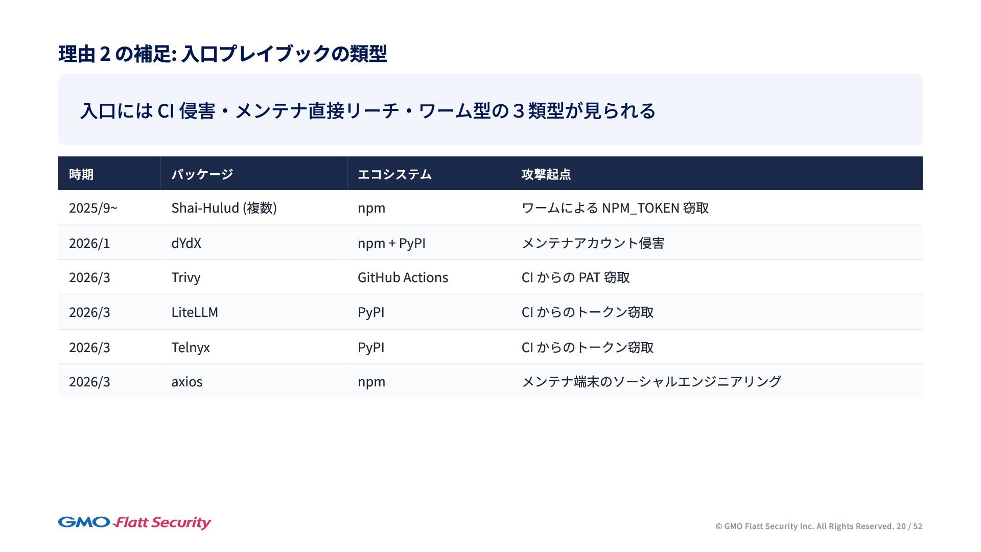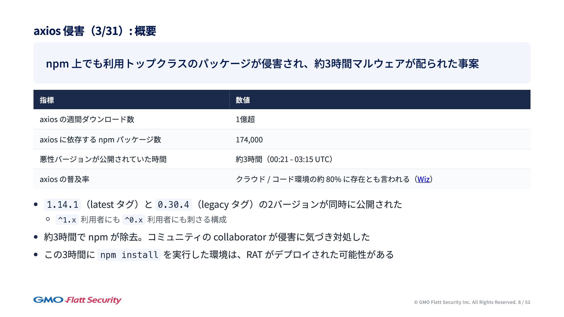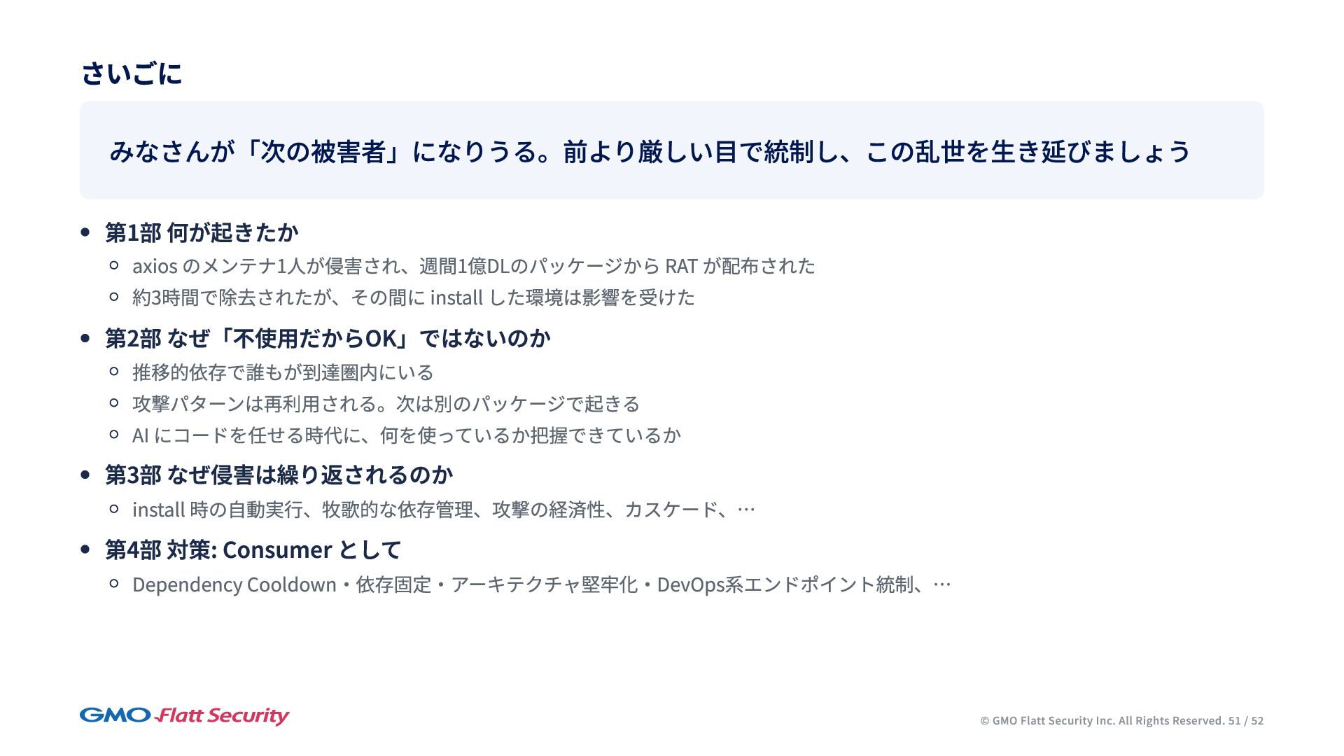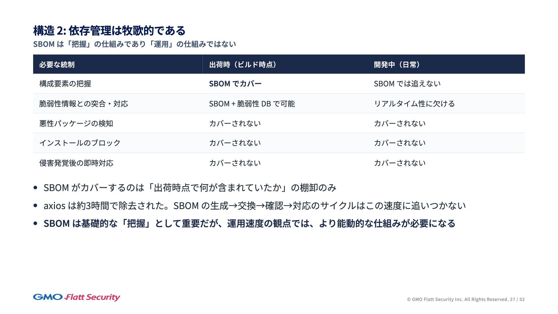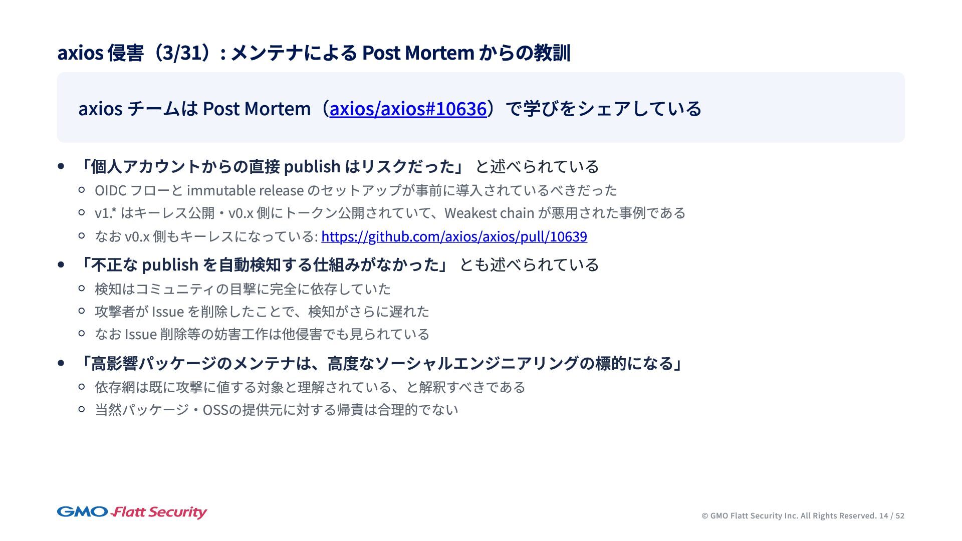 [email protected] ← npm が自動的に解決した(あなたは選んでいない) postinstall: node setup.js ← npm が自動的に実行した npm はパッケージの postinstall スクリプトを install 時に自動実行する 推移的依存のスクリプトも実行される。gatsby を入れただけで axios の postinstall が走る 構造的には、これさえ無ければ、攻撃のステップは 1 つ増える(→ 攻撃者にとって面倒が増える) 実際、pnpm v10~ はこの挙動をデフォルトでブロックする方向に転じている 許可リスト( allowBuilds )に明示的に登録したパッケージのみ実行を許可する挙動をとる Bun も Top 500 パッケージの許可リスト + trustedDependencies で制御しているよう 構造 1: install 時のコード自動実行の仕組みがある © GMO Flatt Security Inc. All Rights Reserved. 23 / 52