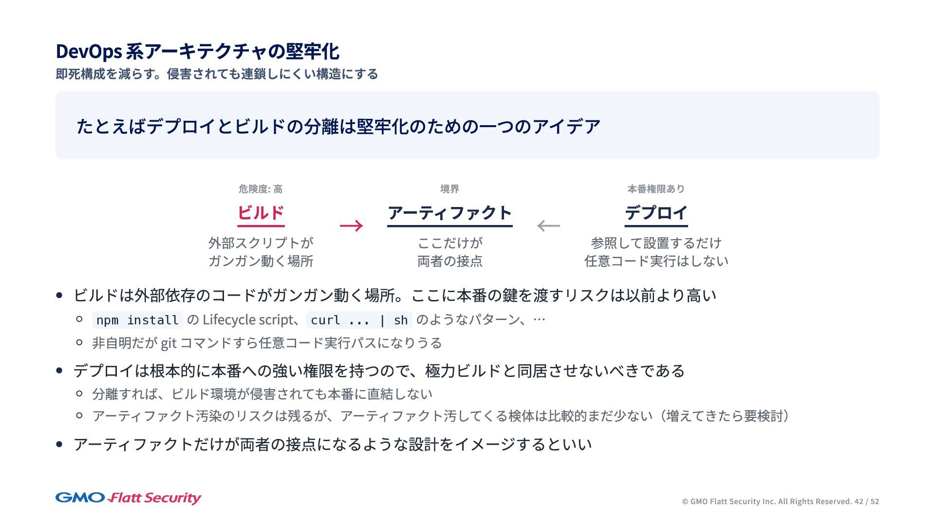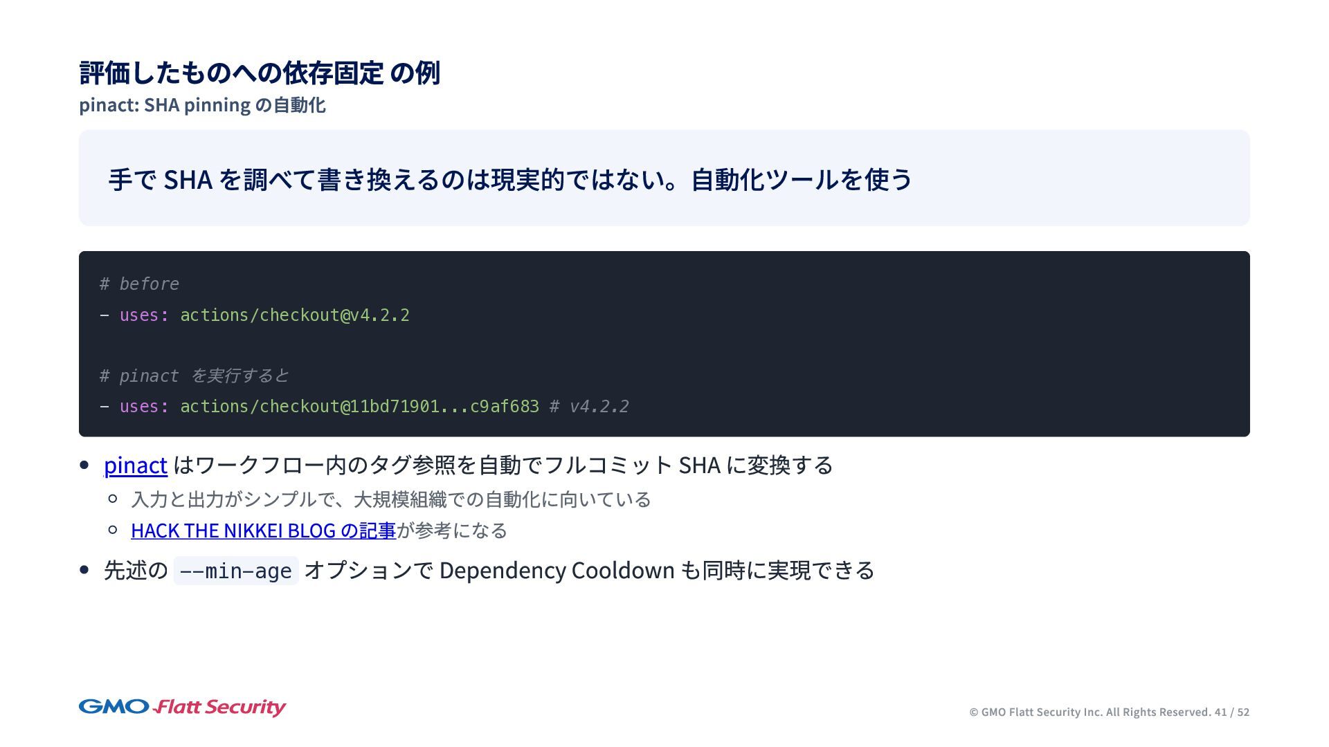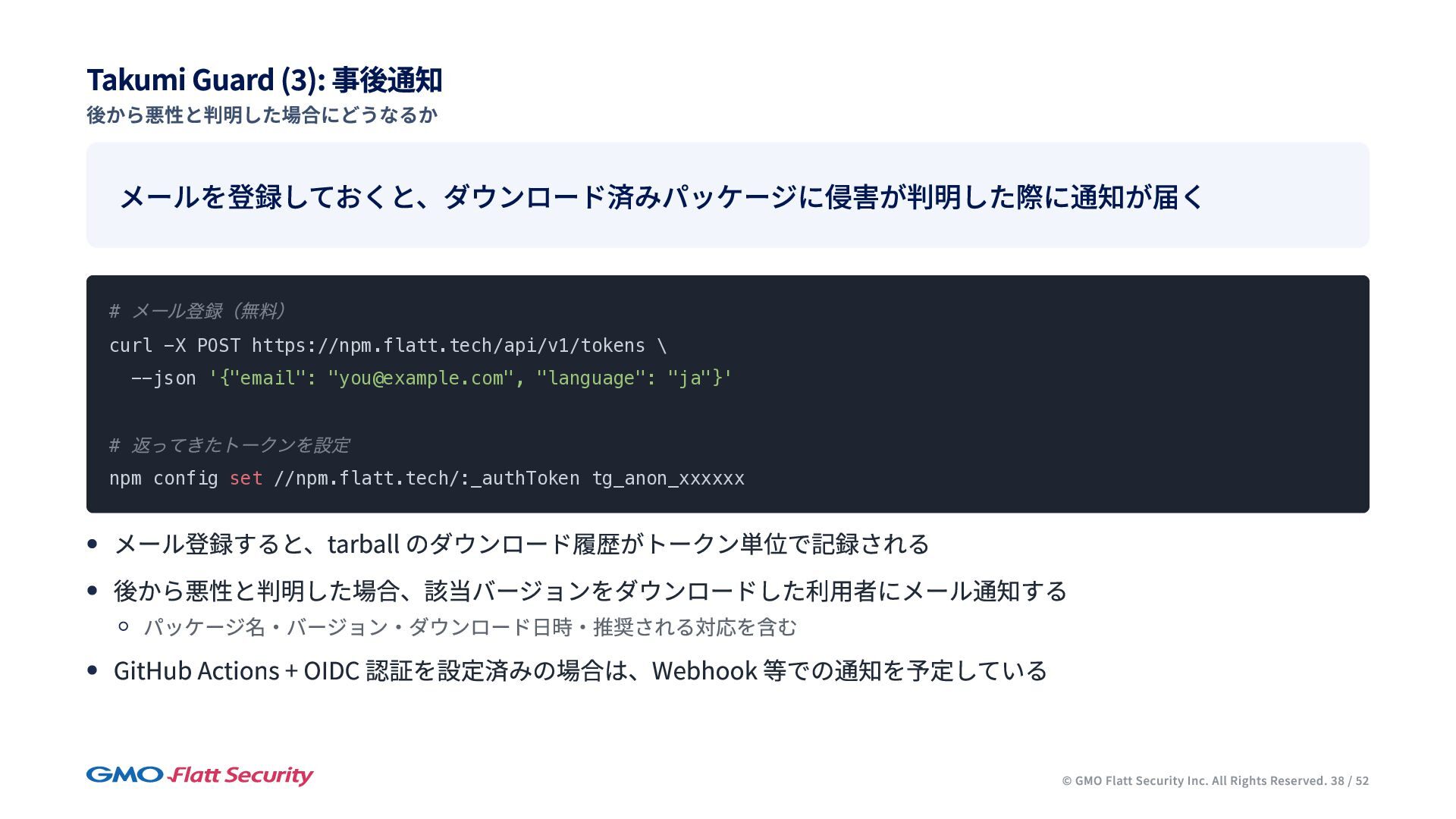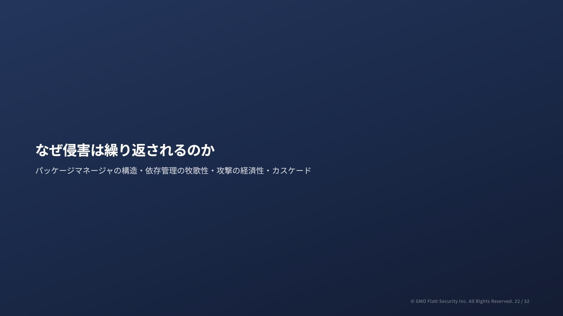 [email protected] ← npm が自動的に解決した(あなたは選んでいない) postinstall: node setup.js ← npm が自動的に実行した npm はパッケージの postinstall スクリプトを install 時に自動実行する 推移的依存のスクリプトも実行される。gatsby を入れただけで axios の postinstall が走る 構造的には、これさえ無ければ、攻撃のステップは 1 つ増える(→ 攻撃者にとって面倒が増える) 実際、pnpm v10~ はこの挙動をデフォルトでブロックする方向に転じている 許可リスト( allowBuilds )に明示的に登録したパッケージのみ実行を許可する挙動をとる Bun も Top 500 パッケージの許可リスト + trustedDependencies で制御しているよう 構造 1: install 時のコード自動実行の仕組みがある © GMO Flatt Security Inc. All Rights Reserved. 23 / 52