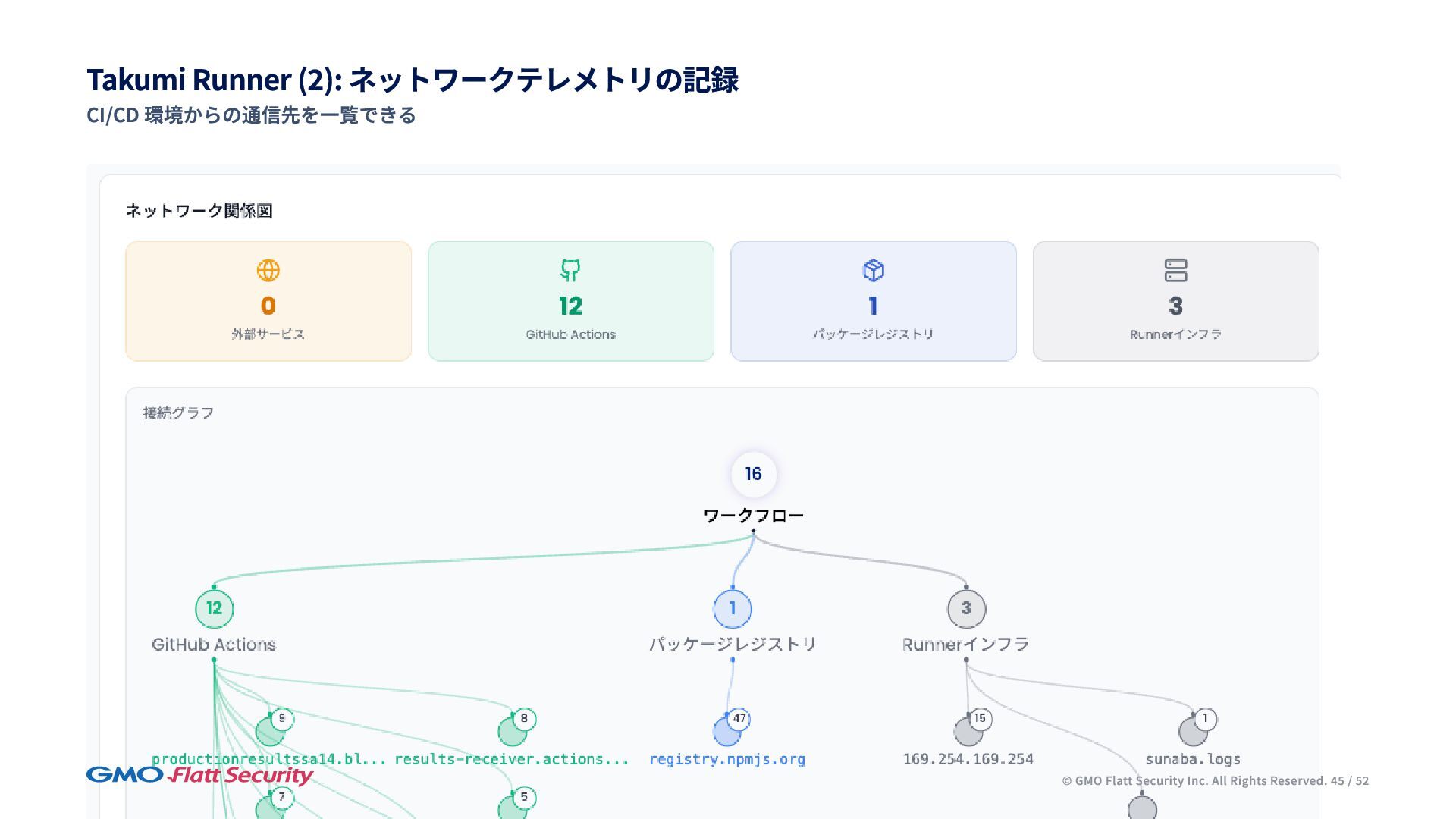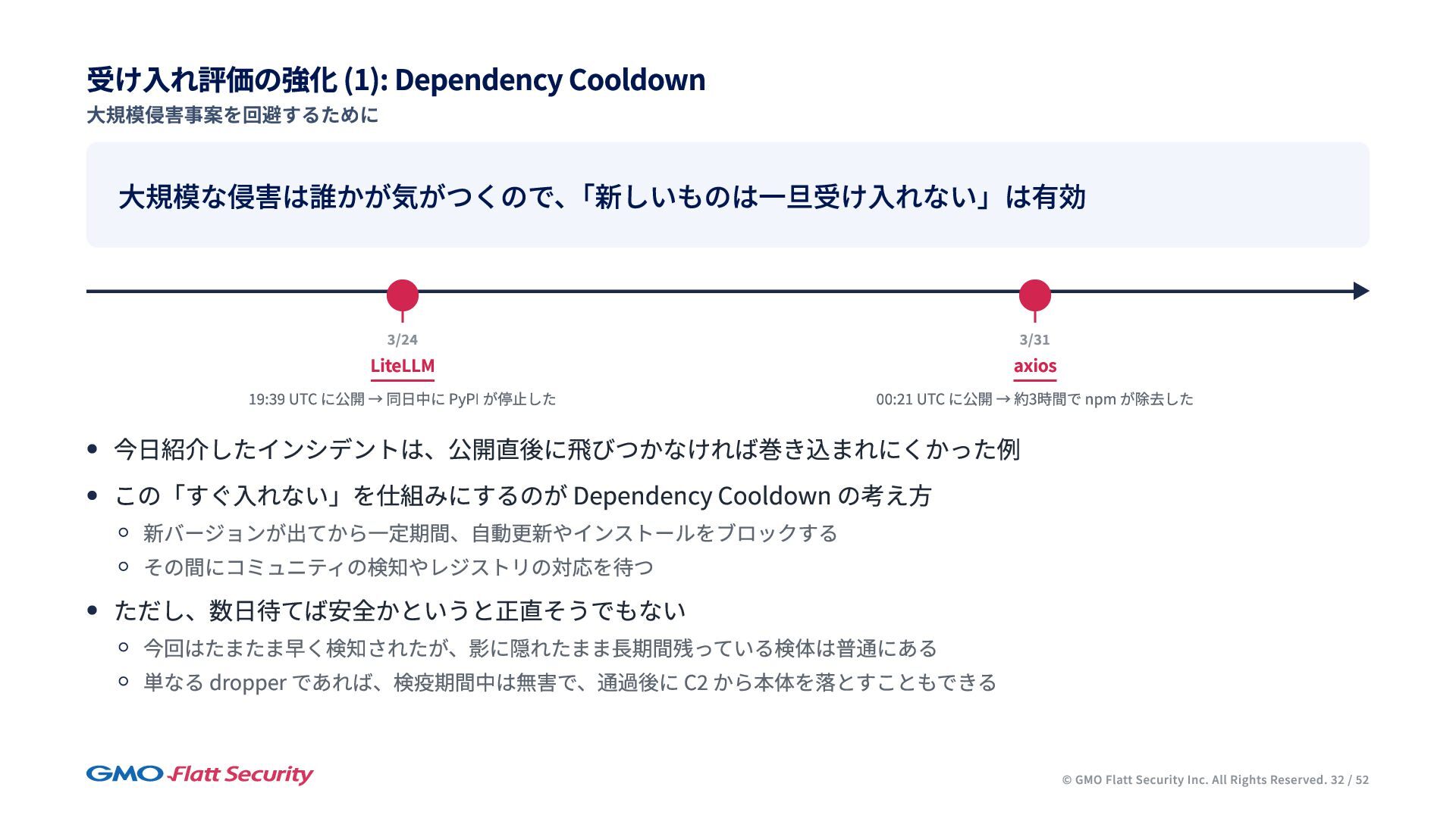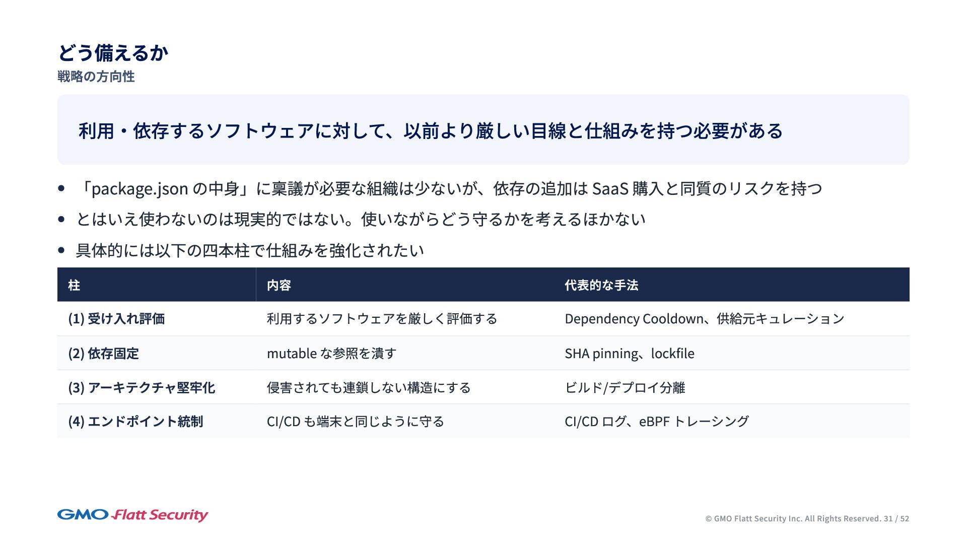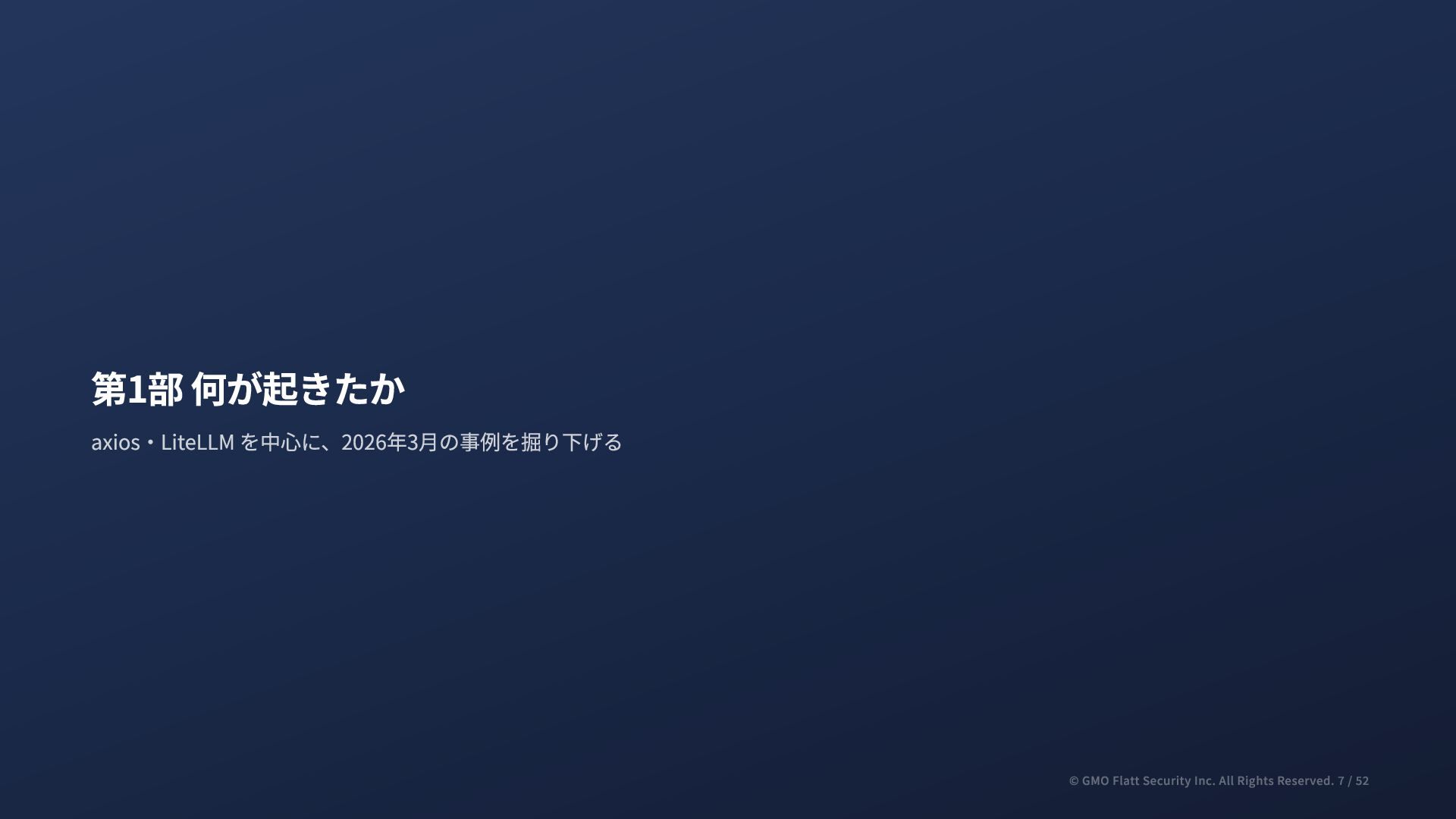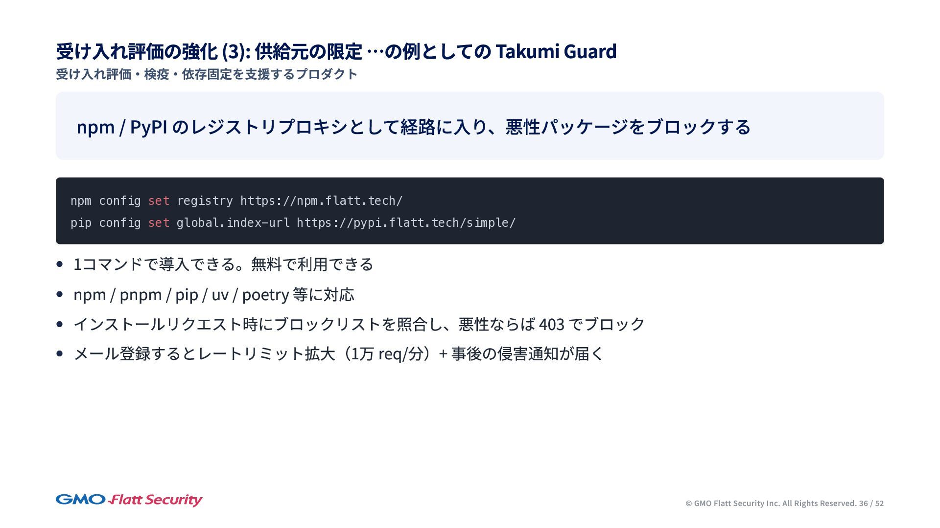 [email protected] ← npm が自動的に解決した(あなたは選んでいない) postinstall: node setup.js ← npm が自動的に実行した npm はパッケージの postinstall スクリプトを install 時に自動実行する 推移的依存のスクリプトも実行される。gatsby を入れただけで axios の postinstall が走る 構造的には、これさえ無ければ、攻撃のステップは 1 つ増える(→ 攻撃者にとって面倒が増える) 実際、pnpm v10~ はこの挙動をデフォルトでブロックする方向に転じている 許可リスト( allowBuilds )に明示的に登録したパッケージのみ実行を許可する挙動をとる Bun も Top 500 パッケージの許可リスト + trustedDependencies で制御しているよう 構造 1: install 時のコード自動実行の仕組みがある © GMO Flatt Security Inc. All Rights Reserved. 23 / 52